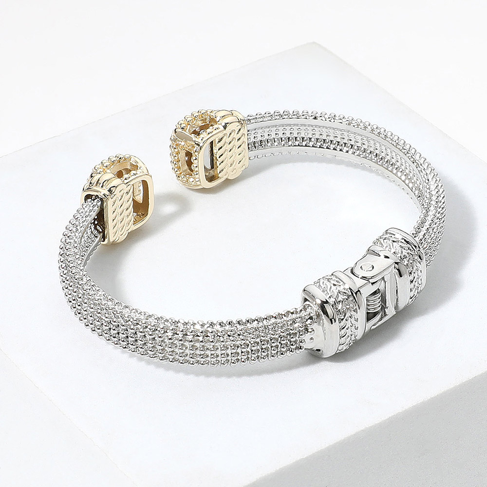 • Elegant textured cuff bracelet adorned with two faceted gemstone accents set in detailed mounts. A sophisticated piece combining bold charm and refined craftsmanship for a timeless accessory upgrade.