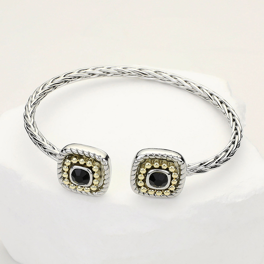 Details • Size : 0.6" H, 2.2" D • Cuff • Elegant cuff bracelet featuring a braided band and two square end accents with textured detailing. This bold yet refined piece adds a distinctive touch to any accessory collection, perfect for everyday sophistication or statement layering.