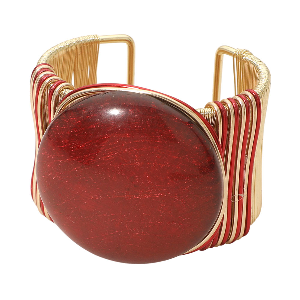 Details • Size : 2" H, 2.3" D • Cuff • Statement cuff bracelet featuring a smooth oval stone centerpiece framed by layered wire detailing. Designed with an open cuff silhouette for easy styling, this bold accessory adds artisanal texture and visual impact to everyday looks, boutique assortments, and gift-ready jewelry collections. • Hypoallergenic • Stainless Steel