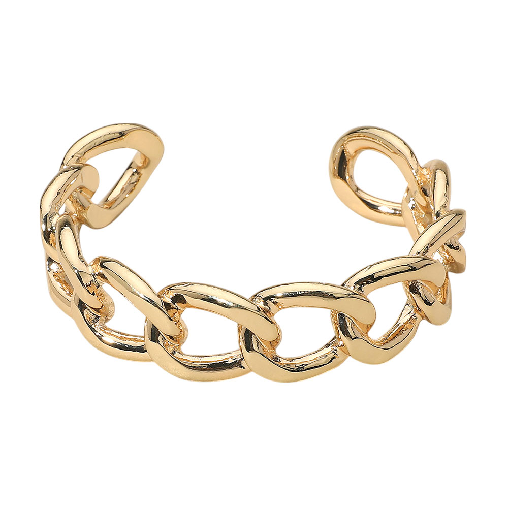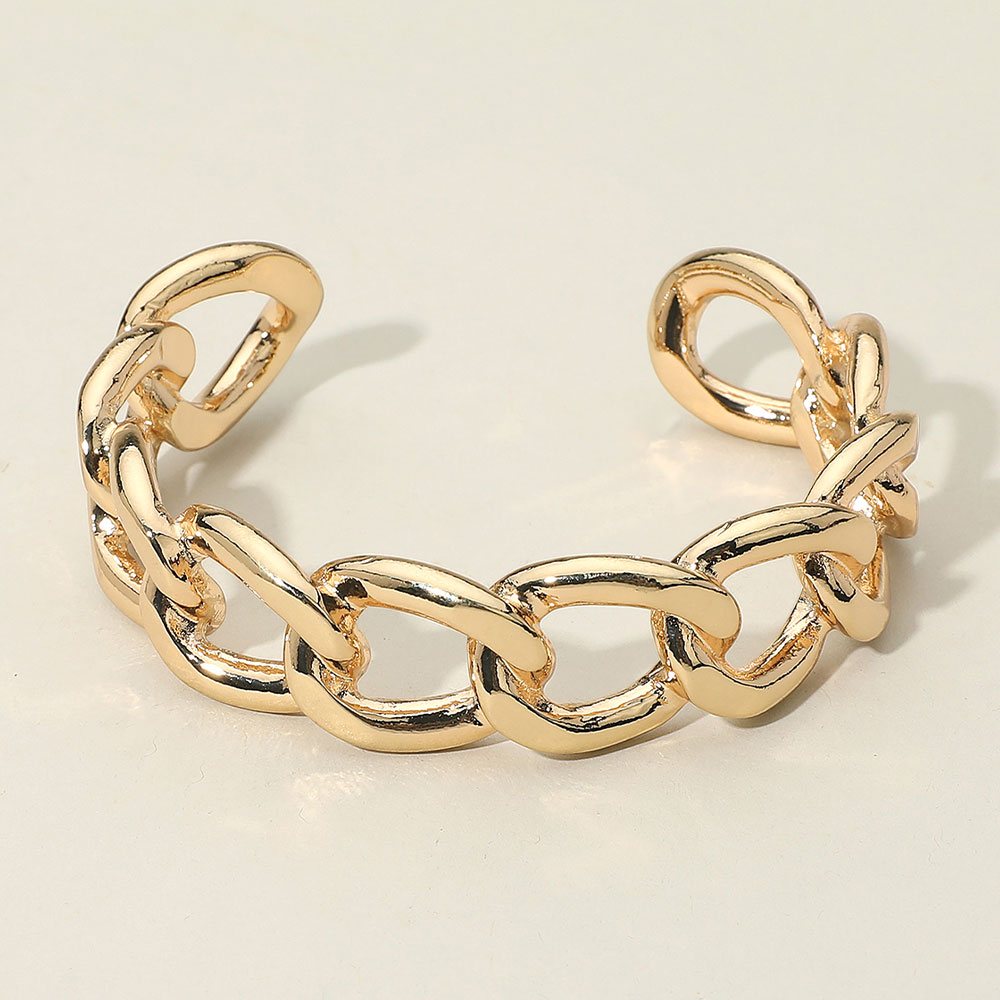 Details • Size : 0.75" H, 2.4" D • Cuff • Bold link chain open cuff bracelet with a statement silhouette. Adds edgy charm to any outfit and is perfect for stacking or wearing solo. A trendy accessory for casual or dressy looks. • Brass • Lead and Nickel Compliant