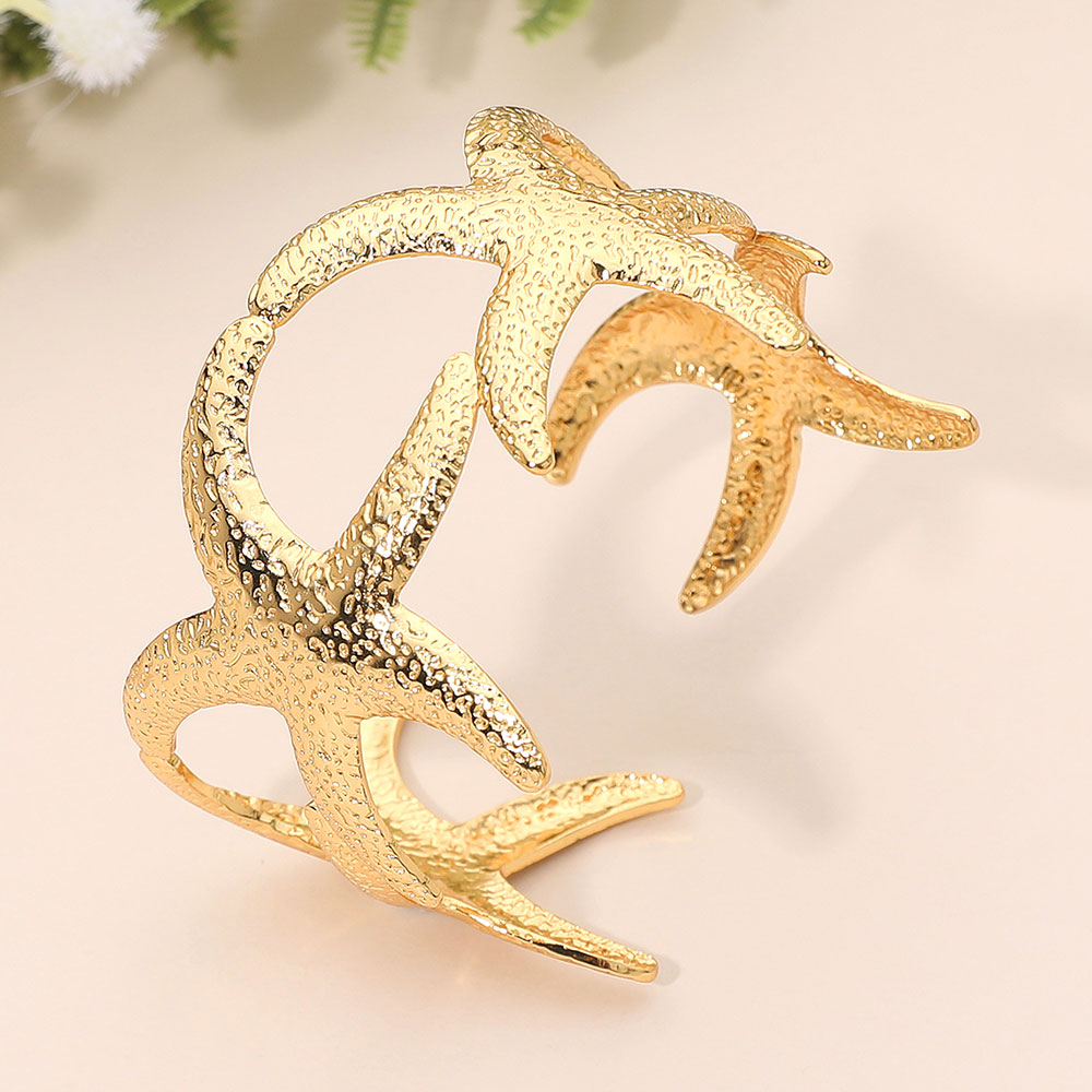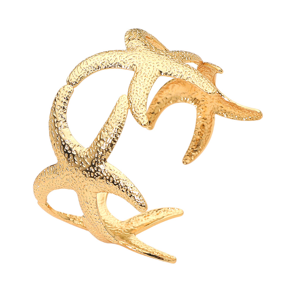 Details • Size : 1.6" H • Cuff / Adjustable • Water Resistant • Bold starfish cuff bracelet featuring sculptural open detailing for a striking coastal-inspired look. Designed to add artistic flair and standout style to everyday outfits or resort-ready ensembles, this statement bracelet offers effortless elegance worn alone or layered with favorite accessories. • Hypoallergenic • Stainless Steel