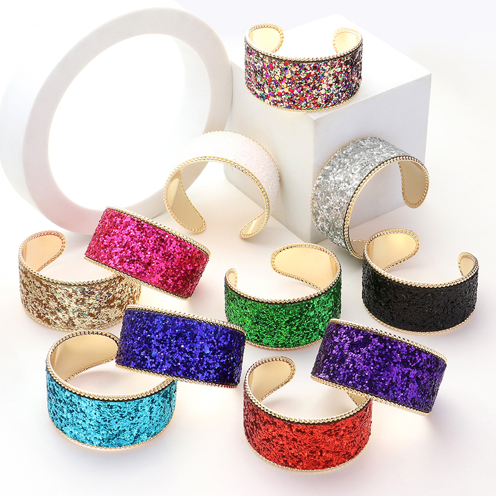 Details • Size : 1.25" H, 2.25" D • Cuff • Add bold sparkle to your look with a wide cuff bracelet covered in glitter and framed by elegant beaded edges. Perfect for parties, nights out, or special occasions, this statement piece delivers eye-catching glamour and standout style with ease. • Lead and Nickel Compliant