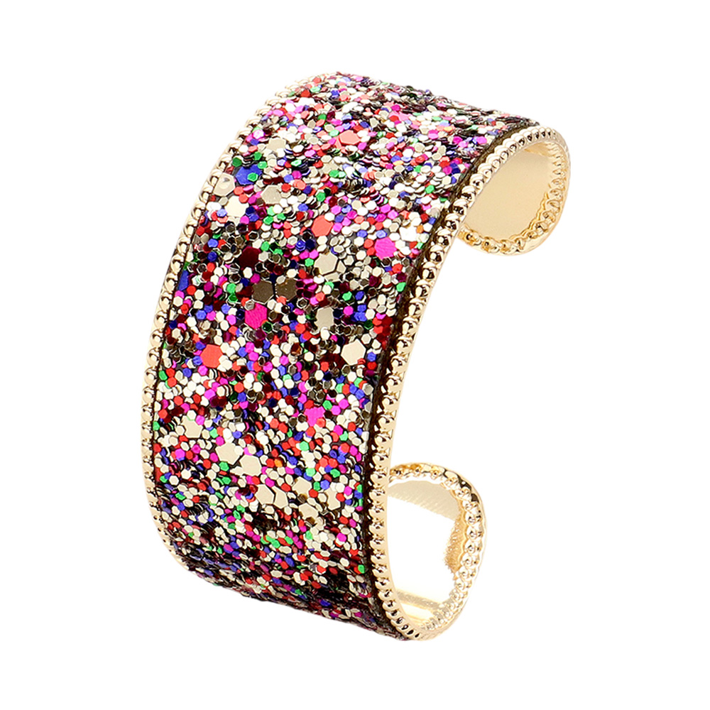 Details • Size : 1.25" H, 2.25" D • Cuff • Add bold sparkle to your look with a wide cuff bracelet covered in glitter and framed by elegant beaded edges. Perfect for parties, nights out, or special occasions, this statement piece delivers eye-catching glamour and standout style with ease. • Lead and Nickel Compliant