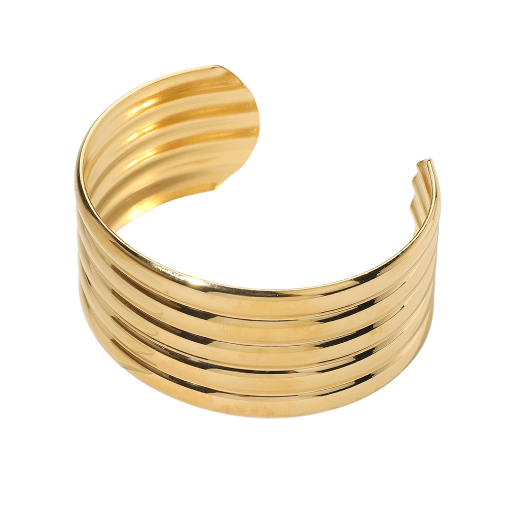 • Wide ribbed cuff bracelet with a bold, sculpted finish. Adds statement style to any outfit. Open-back design for easy wear and comfort. A modern accessory for both casual and formal looks.