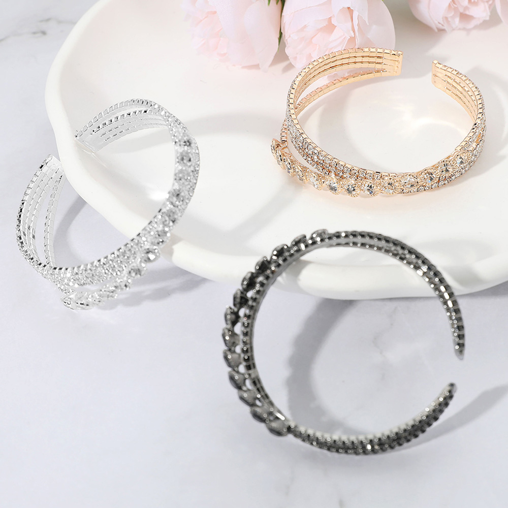 Details • Size : 0.7" H, 2.3" D • Cuff • Shine with elegance in this rhinestone cuff bracelet featuring a chic open design and sparkling accents. Perfect for weddings, proms, parties, and formal events, this versatile bracelet adds a touch of glamour to evening gowns, cocktail dresses, and special occasion outfits. • Lead and Nickel Compliant