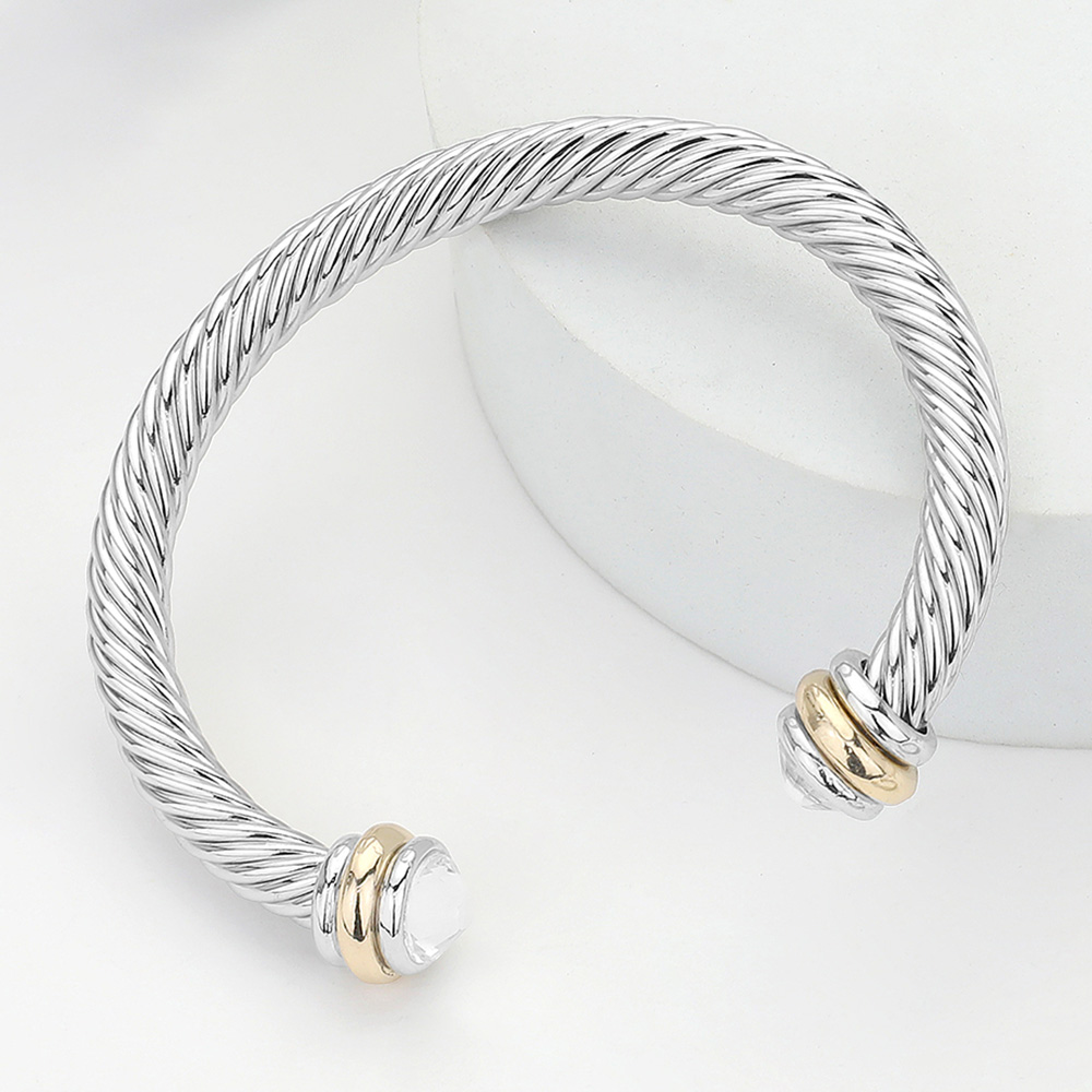 Details • Size : 0.4" H, 2.4" D • Cuff • This twisted open cuff bracelet features a timeless rope-inspired design with dual tone accents on each end for added sophistication. Its open style ensures easy wear and versatile pairing, making it a chic accessory for both casual looks and elegant outfits. • Lead and Nickel Compliant