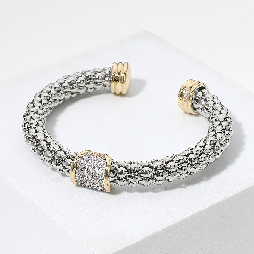 Details • Size : 0.4" H, 2.2" D • Cuff • Elevate your wristwear with this bold textured silver cuff bracelet, highlighted by polished gold-tone end caps and a dazzling cubic zirconia centerpiece. Its intricate beaded design delivers a luxurious feel, perfect for adding elegance to any outfit. • CZ Cubic Zirconia