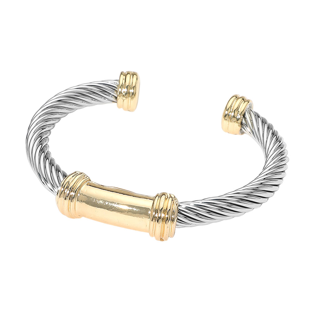 Details • Size : 0.5" H, 2.3" D • Cuff • Elevate your wristwear with this elegant two-tone cable cuff bracelet, featuring sleek twisted metal and polished gold-tone accents for a refined finish.