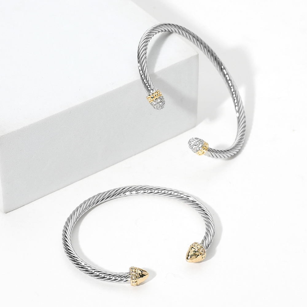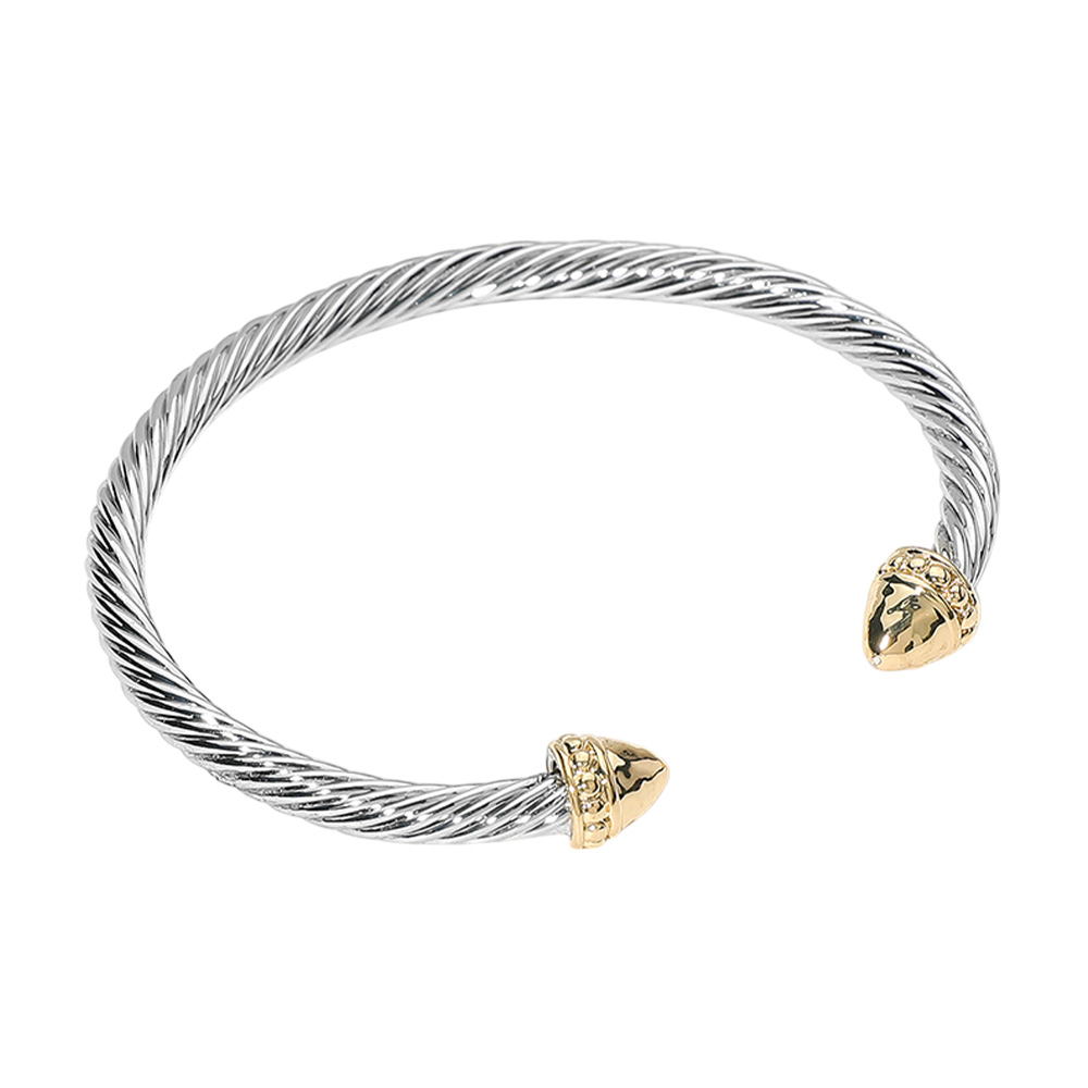 • Elevate your style with this classic cable cuff bracelet, featuring a sleek twisted silver-tone band and polished gold-tone acorn-shaped end caps. A timeless accessory that blends sophistication with everyday versatility, perfect for stacking or wearing solo.