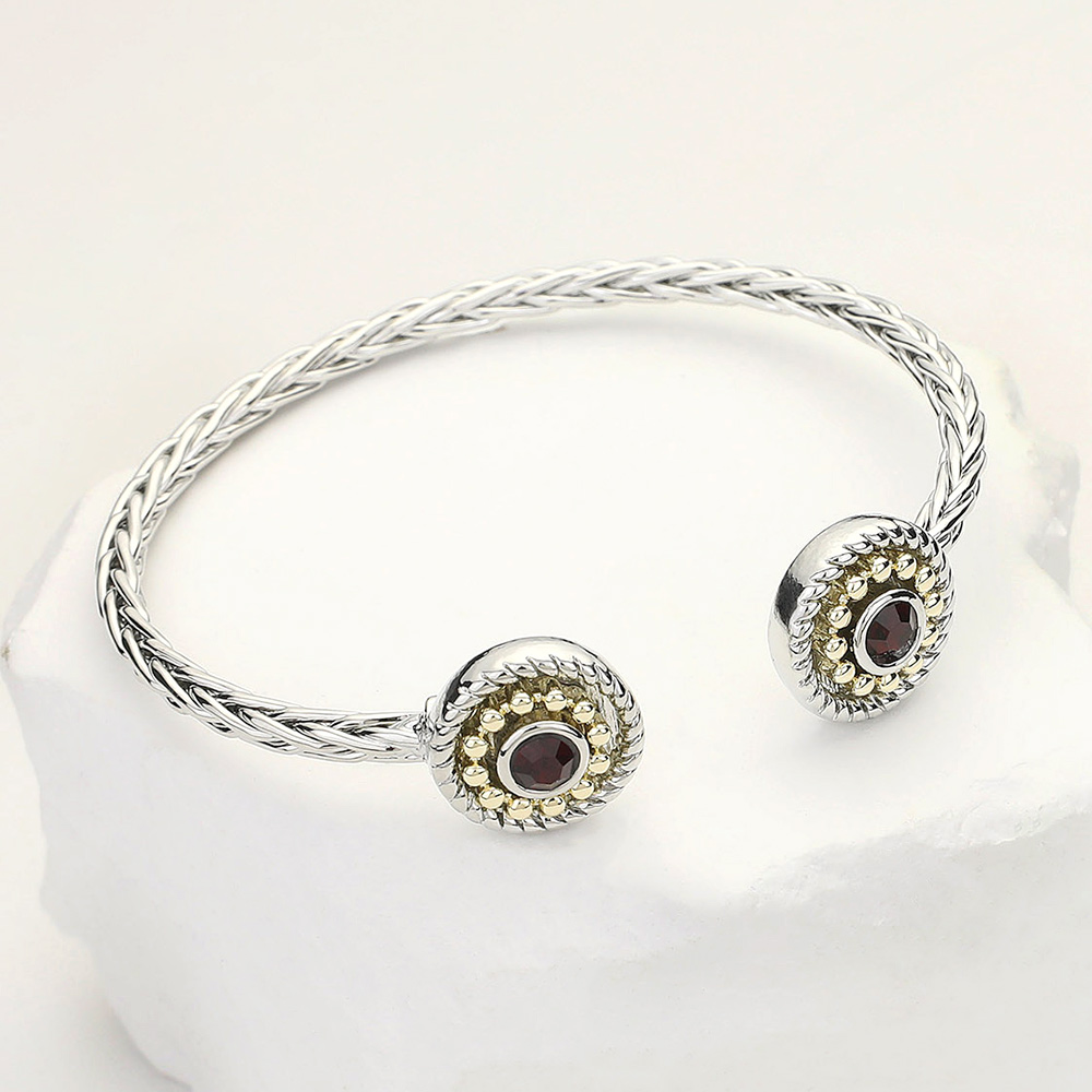Details • Size : 0.6" H, 2.25" D • Cuff • Chic open cuff bracelet featuring twisted detailing and round gemstone-accented ends. A refined accessory that adds a touch of elegance and character to both casual and formal outfits.
