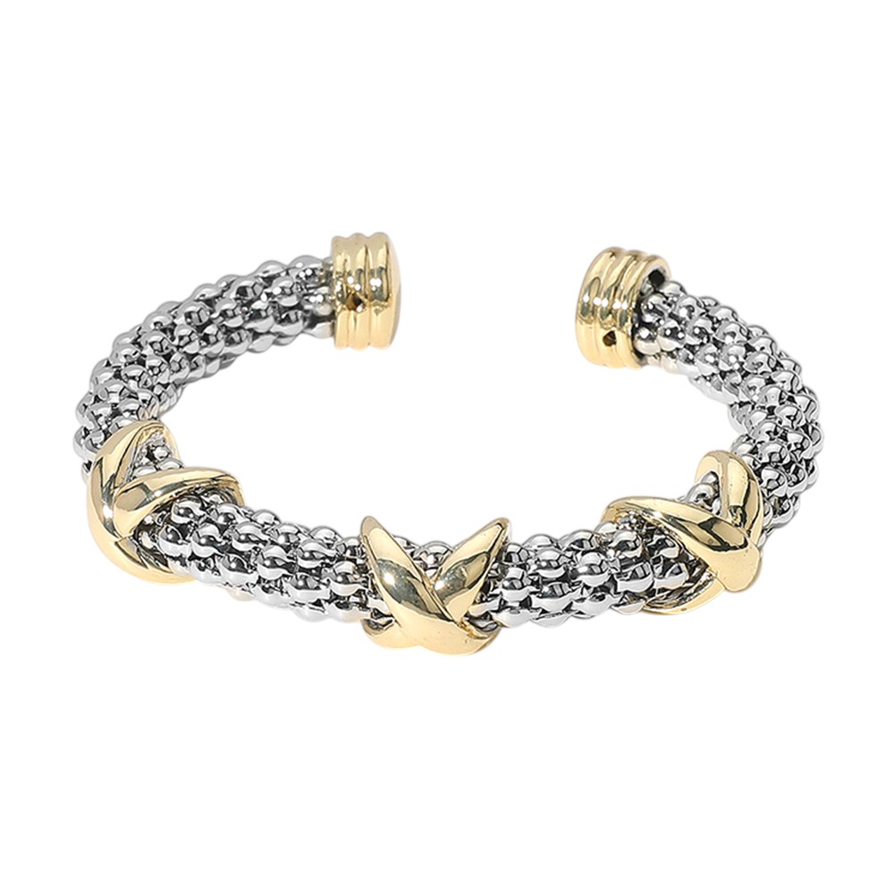 Details • Size : 0.5" H, 2.3" D • Cuff • Make a statement with this structured cuff bracelet, showcasing textured metal bands and prominent X-shaped detailing for a stylish, standout look.