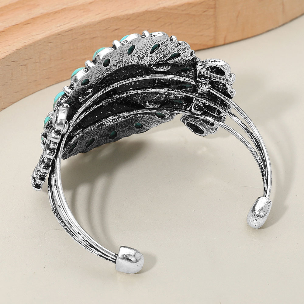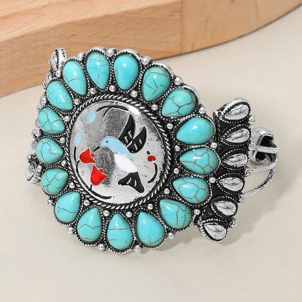 Details • Size : 2.1" H, 2.5" D • Cuff • Make a bold statement with this western-inspired hummingbird cuff bracelet featuring an ornate center scene framed by faceted teardrop accents. The adjustable open design sits comfortably on the wrist, adding radiant sparkle and artistic flair to casual outfits, festivals, or special events. • Lead and Nickel Compliant