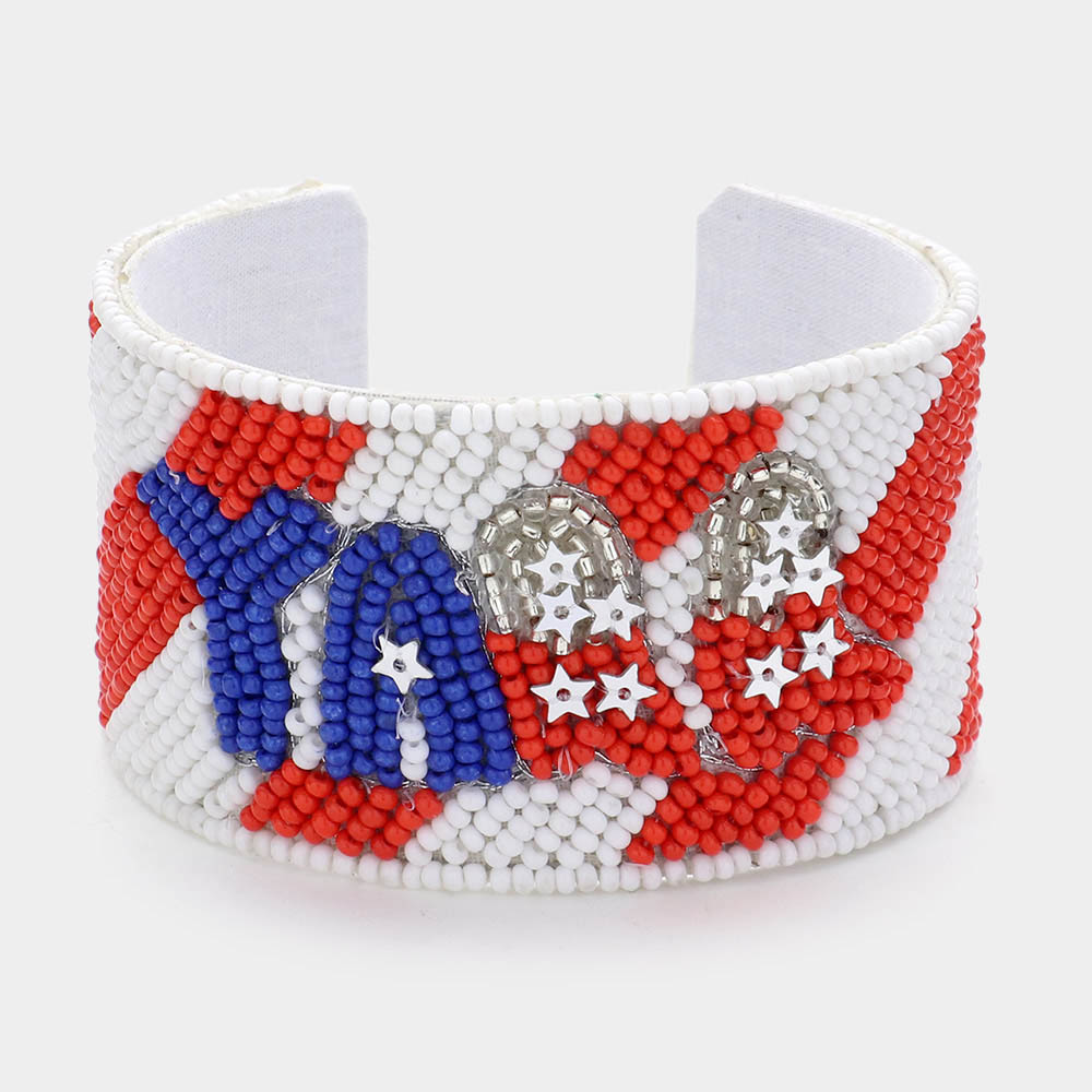 YALL Message American USA Flag Colored Seed Beaded Cuff Bracelet