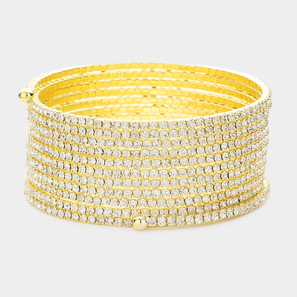 Wide Pearl Rhinestone Lined Adjustable Coil Evening Bracelet