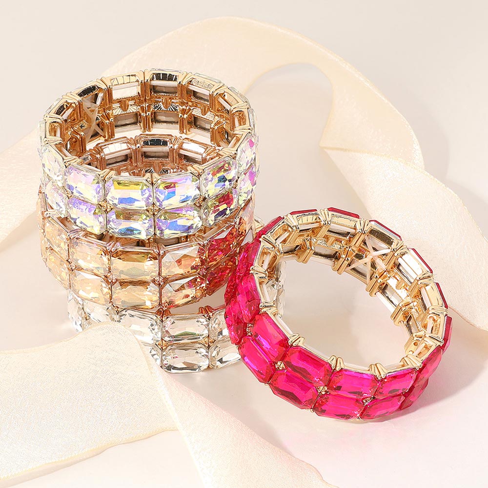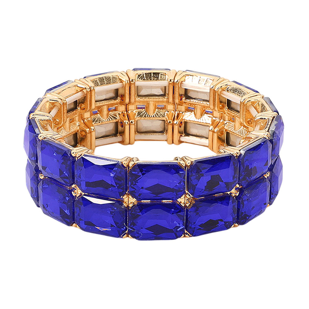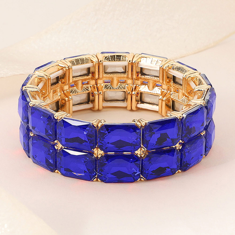 2 Row Rectangle Glass Stone Cluster Stretch Evening Bracelet