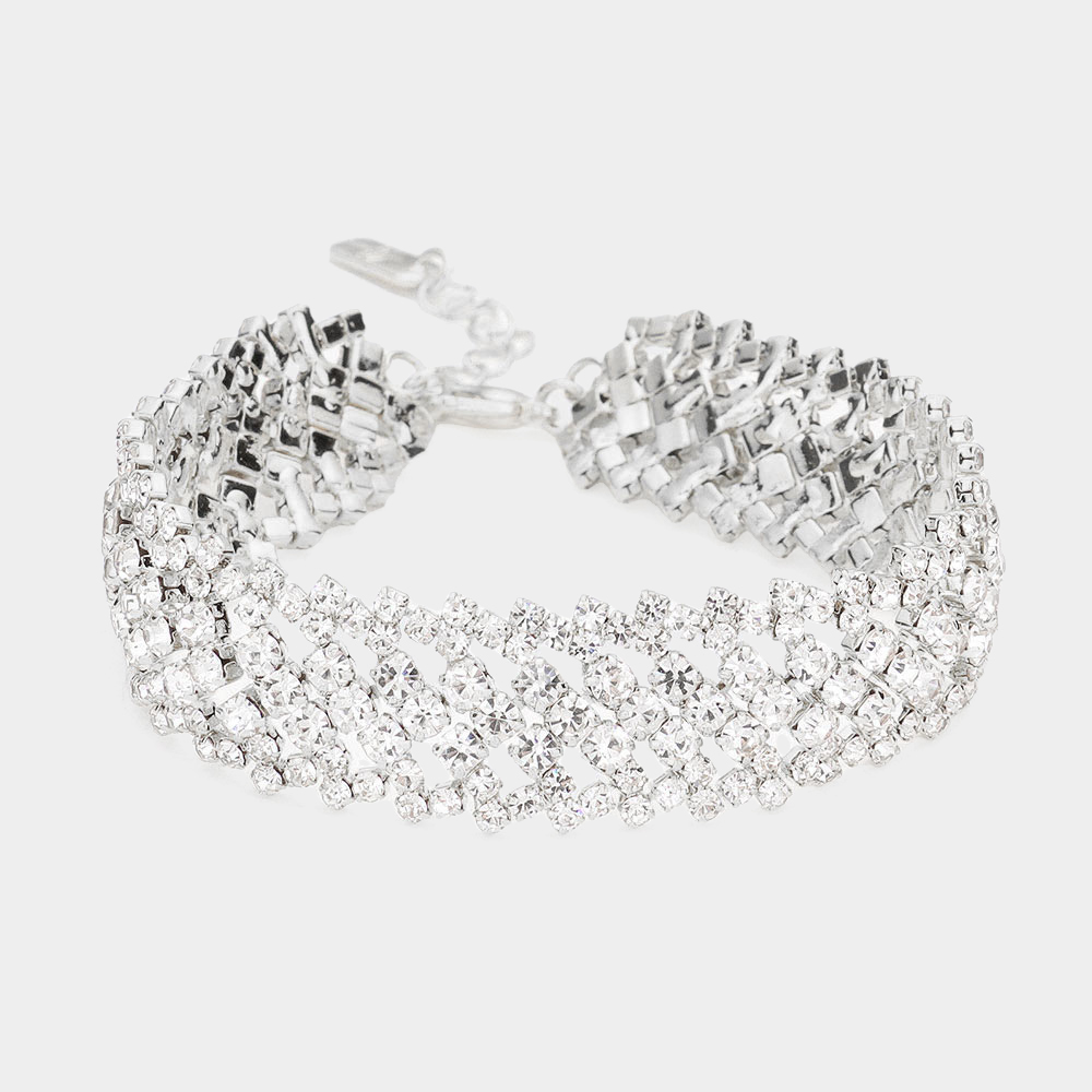 Stone Paved Center Textured Metal Wide Cuff Bracelet