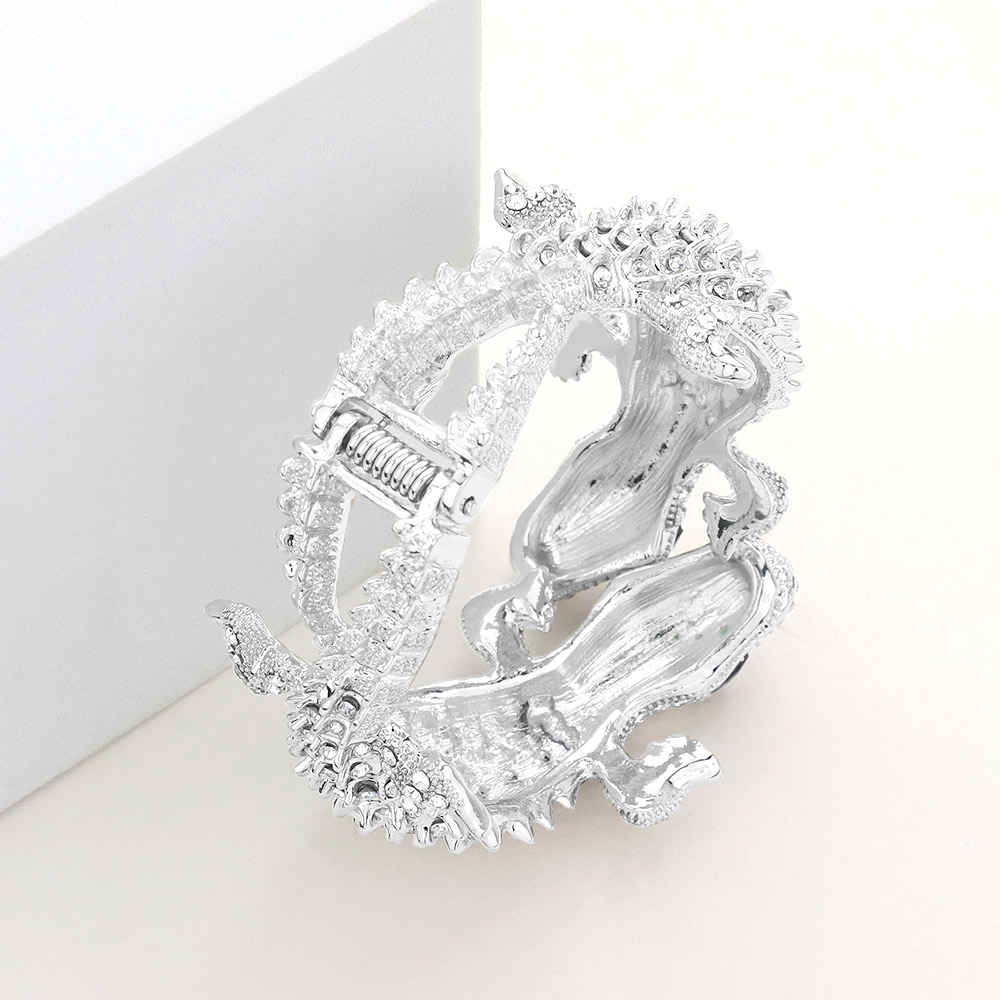 • Make a bold statement with this crystal-studded alligator cuff bracelet. Featuring twin alligator designs encrusted with sparkling rhinestones, this hinged bangle brings fierce style and eye-catching detail to any outfit. A standout piece for animal lovers and fashion risk-takers.