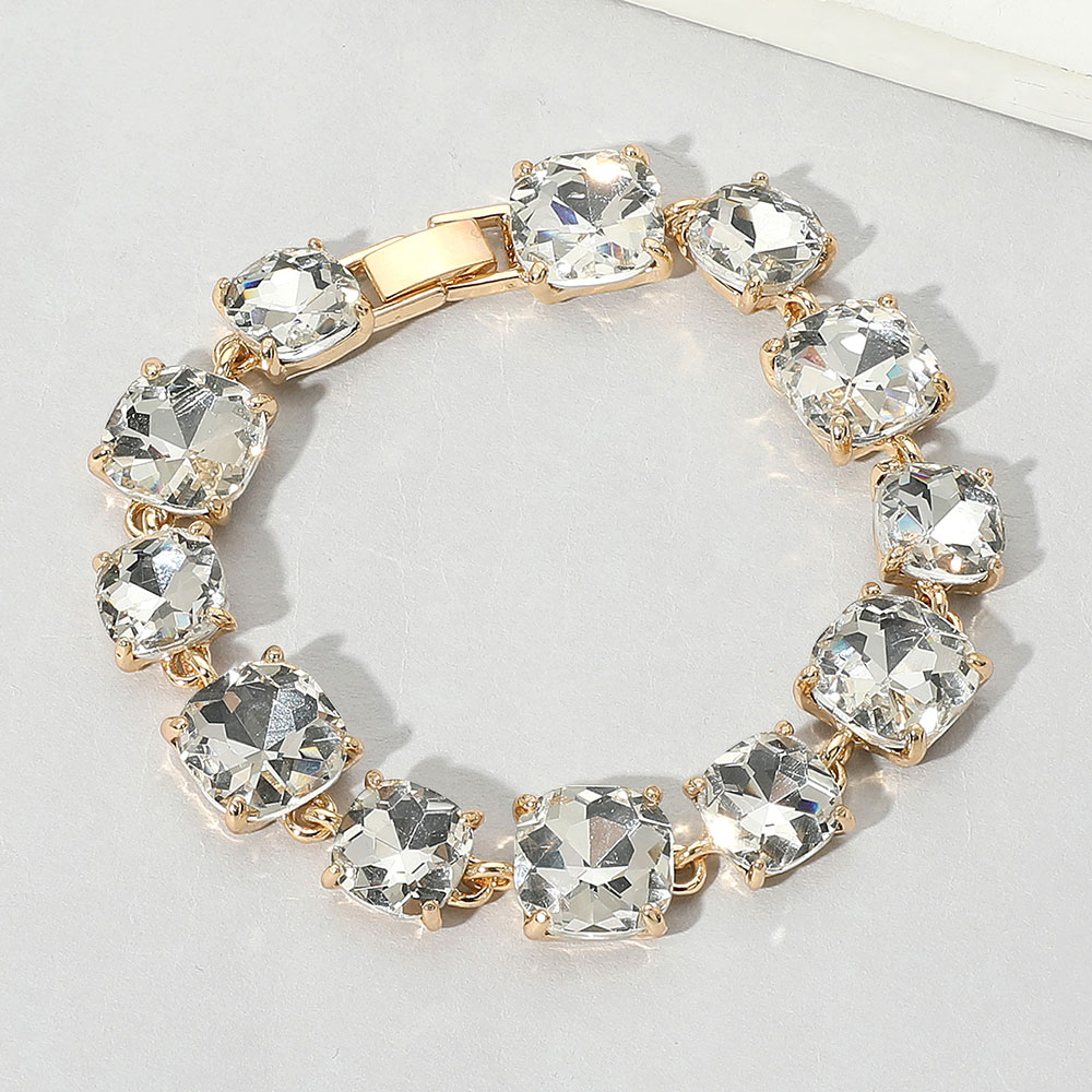 Details • Size : 0.5" H, 7.5" L • Fold Over Closure • Elegant bracelet featuring sparkling square-cut crystals with a vivid, reflective finish. Ideal for parties, weddings, or adding brilliance to formal looks. A radiant accessory that commands attention. • Lead and Nickel Compliant