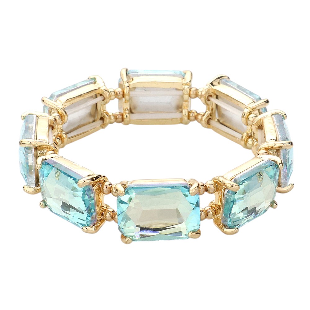 • Elegant emerald-cut crystal stretch bracelet with a faceted gemstone look and gold-tone setting. Perfect for adding a sophisticated sparkle to weddings, parties, or special events.