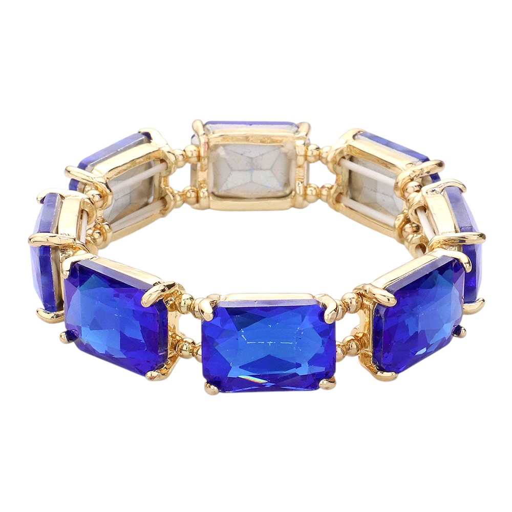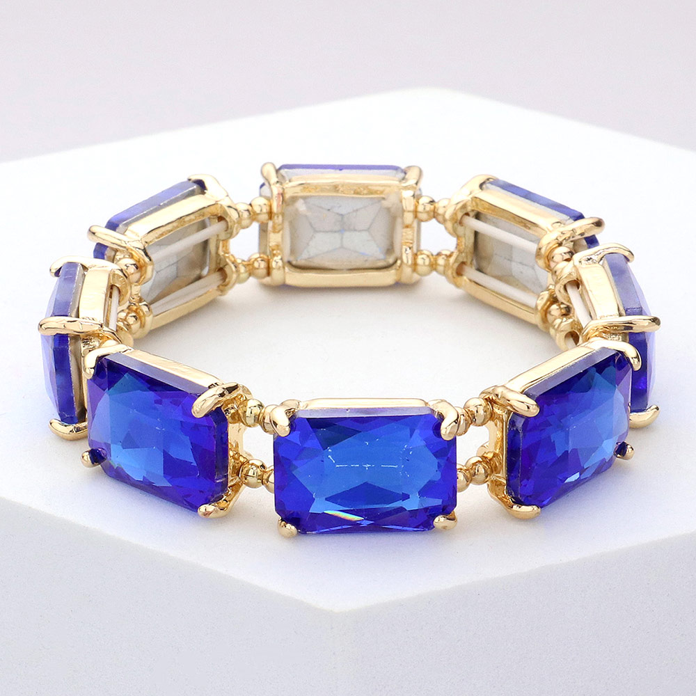 • Elegant emerald-cut crystal stretch bracelet with a faceted gemstone look and gold-tone setting. Perfect for adding a sophisticated sparkle to weddings, parties, or special events.