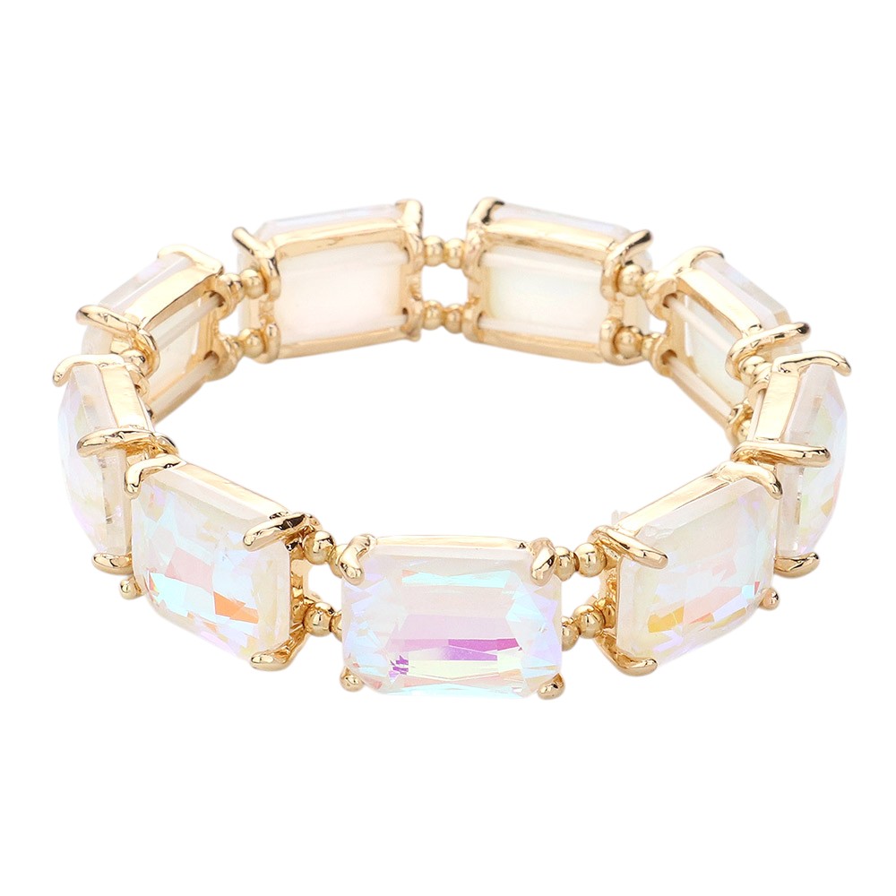• Elegant emerald-cut crystal stretch bracelet with a faceted gemstone look and gold-tone setting. Perfect for adding a sophisticated sparkle to weddings, parties, or special events.
