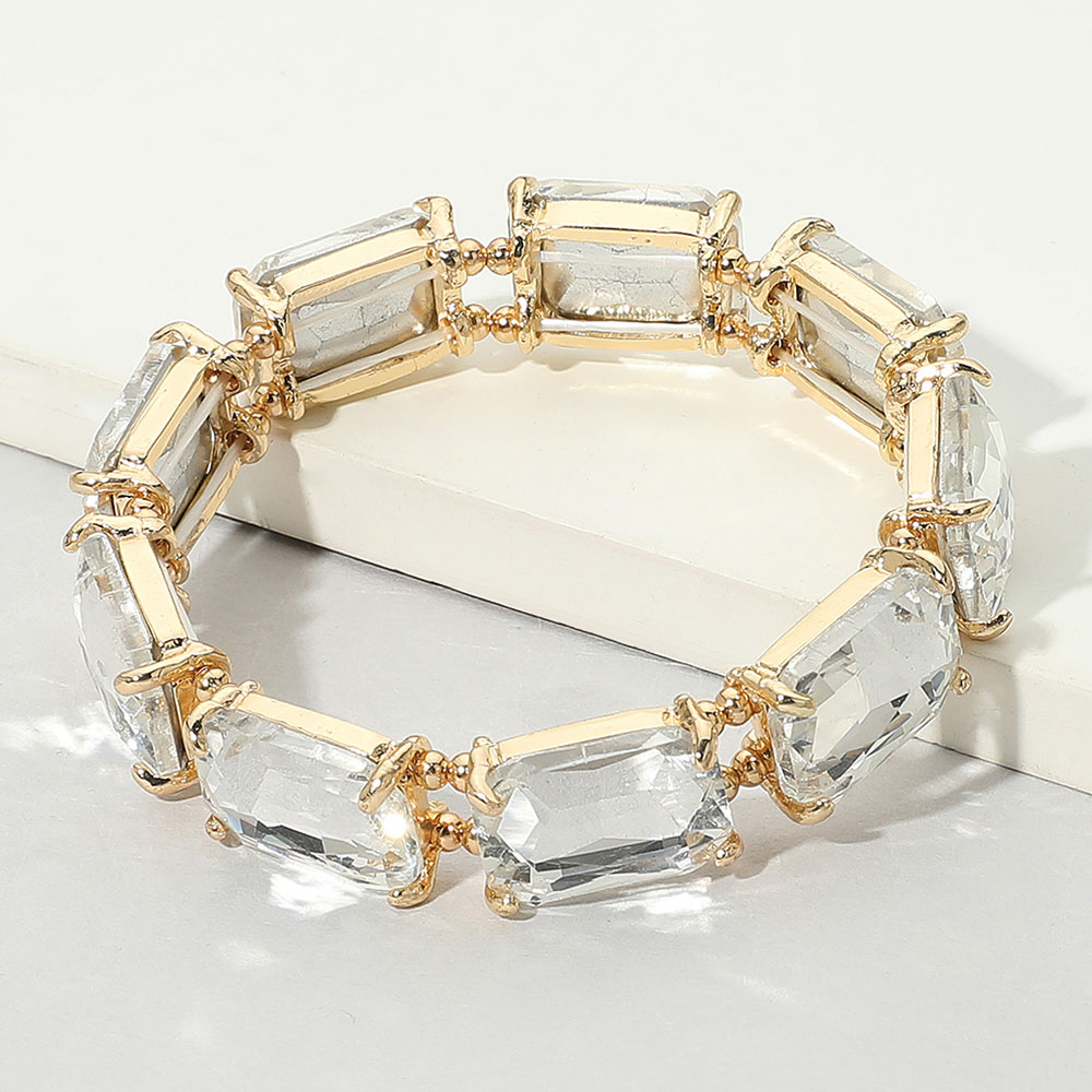 • Elegant emerald-cut crystal stretch bracelet with a faceted gemstone look and gold-tone setting. Perfect for adding a sophisticated sparkle to weddings, parties, or special events.