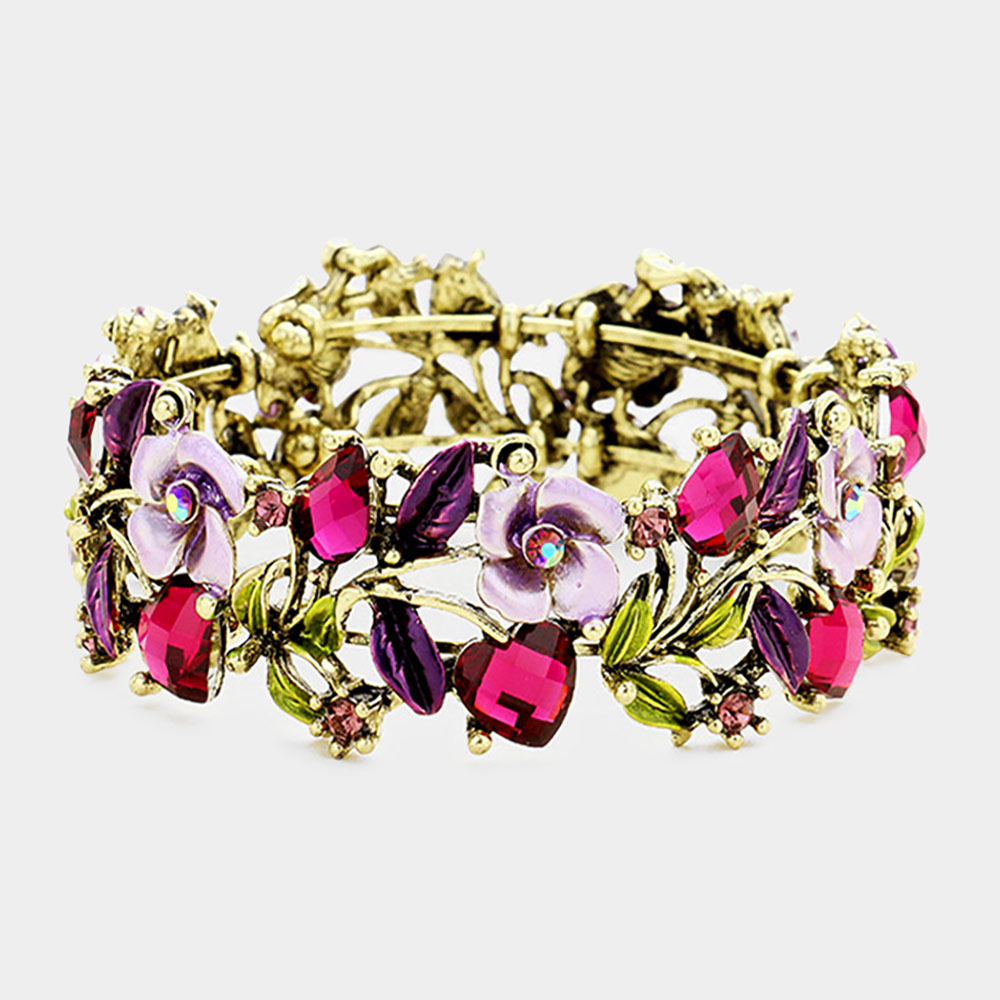Details • Size : 1" H • Adjustable • Brighten your look with a floral statement bracelet featuring vibrant petals, sparkling accents, and intricate detailing. Adjustable for a comfortable fit, this bold accessory brings a touch of whimsy and elegance, making it perfect for special occasions or adding flair to everyday style.