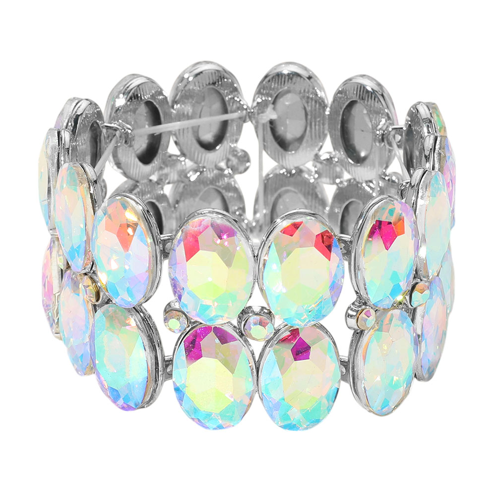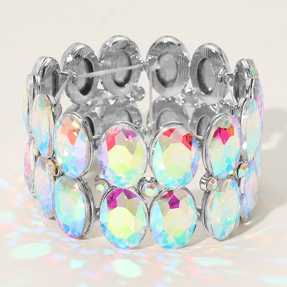 • Bold stretch bracelet featuring dazzling iridescent oval gemstones with a shimmering finish. Comfortable and stylish, this statement piece is perfect for parties, evenings out, or adding a glamorous touch to everyday looks.