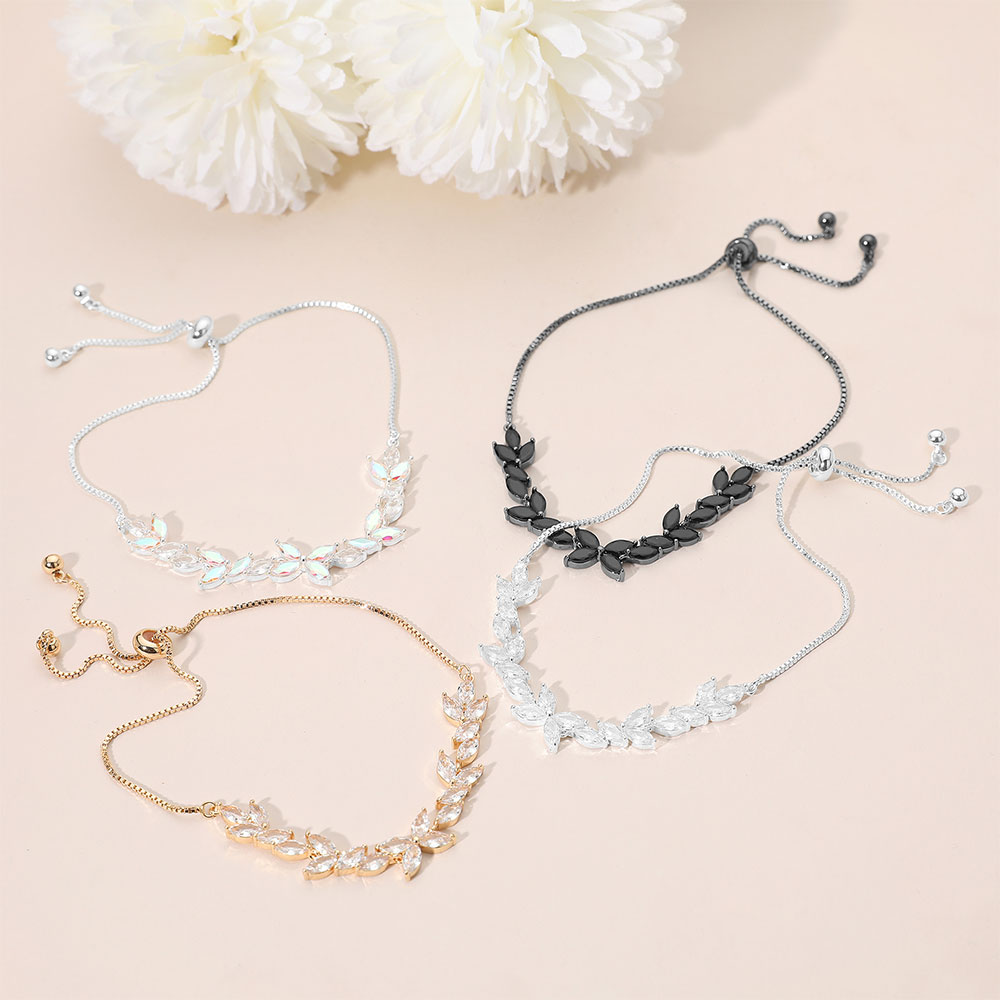 Details • Size : 0.3" H, 10.5" L • Adjustable • This adjustable bracelet features a graceful leaf motif adorned with shimmering crystals, creating a refined and radiant look. Designed for comfort and elegance, it’s an ideal choice for adding subtle sophistication to formal attire or elevating your everyday ensemble effortlessly. • CZ Cubic Zirconia • Lead and Nickel Compliant