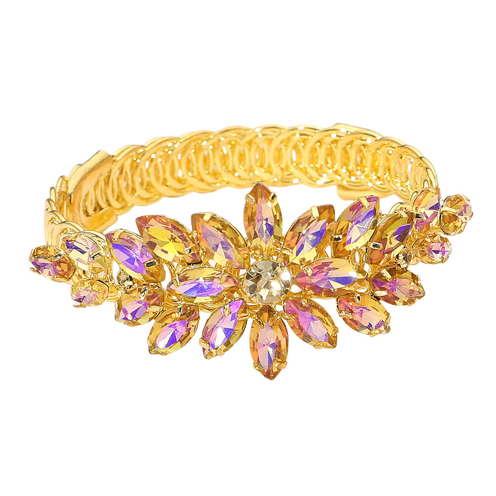 • Shine with elegance in this floral rhinestone stretch bracelet. Designed with dazzling marquise-cut stones arranged in a radiant flower motif, it adds a glamorous sparkle to any look. The flexible band ensures a comfortable fit, making it the perfect accessory for both casual and formal wear.