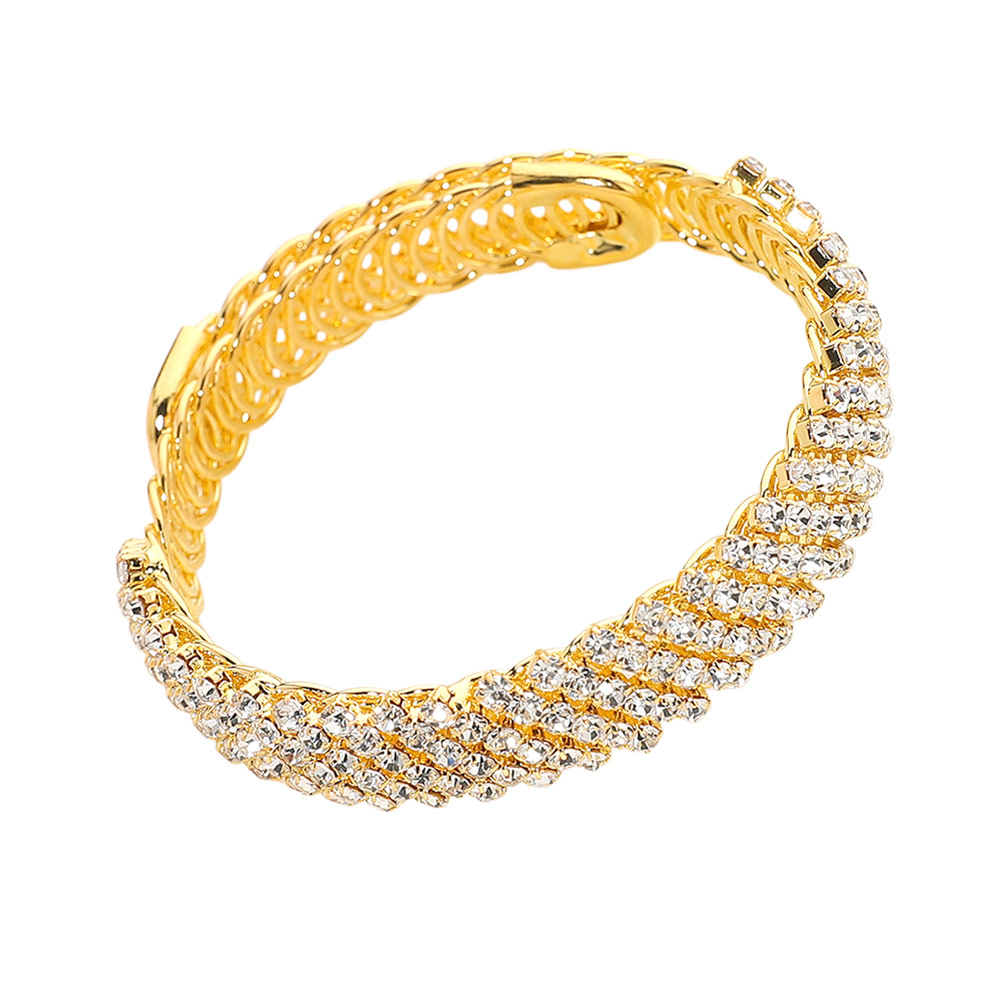Details • Size : 0.5" H • Adjustable • Elevate your style with this sparkling crystal coil bracelet, designed with shimmering stones in a gold tone adjustable wrap bangle. Perfect for weddings, parties, or special occasions, this bracelet adds glamour and sophistication to any outfit while ensuring a comfortable fit.