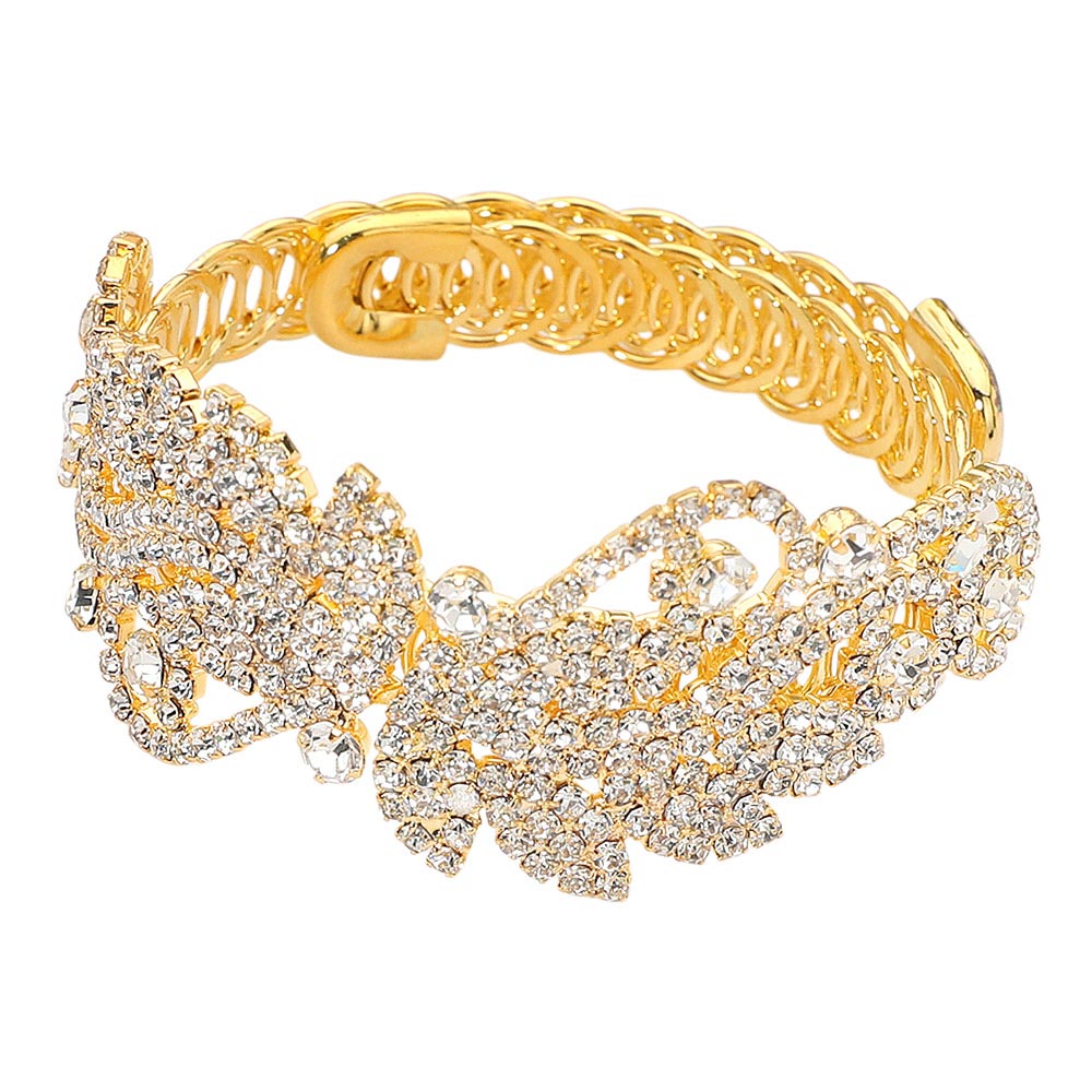 • Sparkling leaf-vine rhinestone bracelet featuring intricate crystal clusters, elegant scrolling accents, and a comfortable adjustable fit. A stunning accessory for formal events, weddings, and special occasions, adding refined shine to any look.