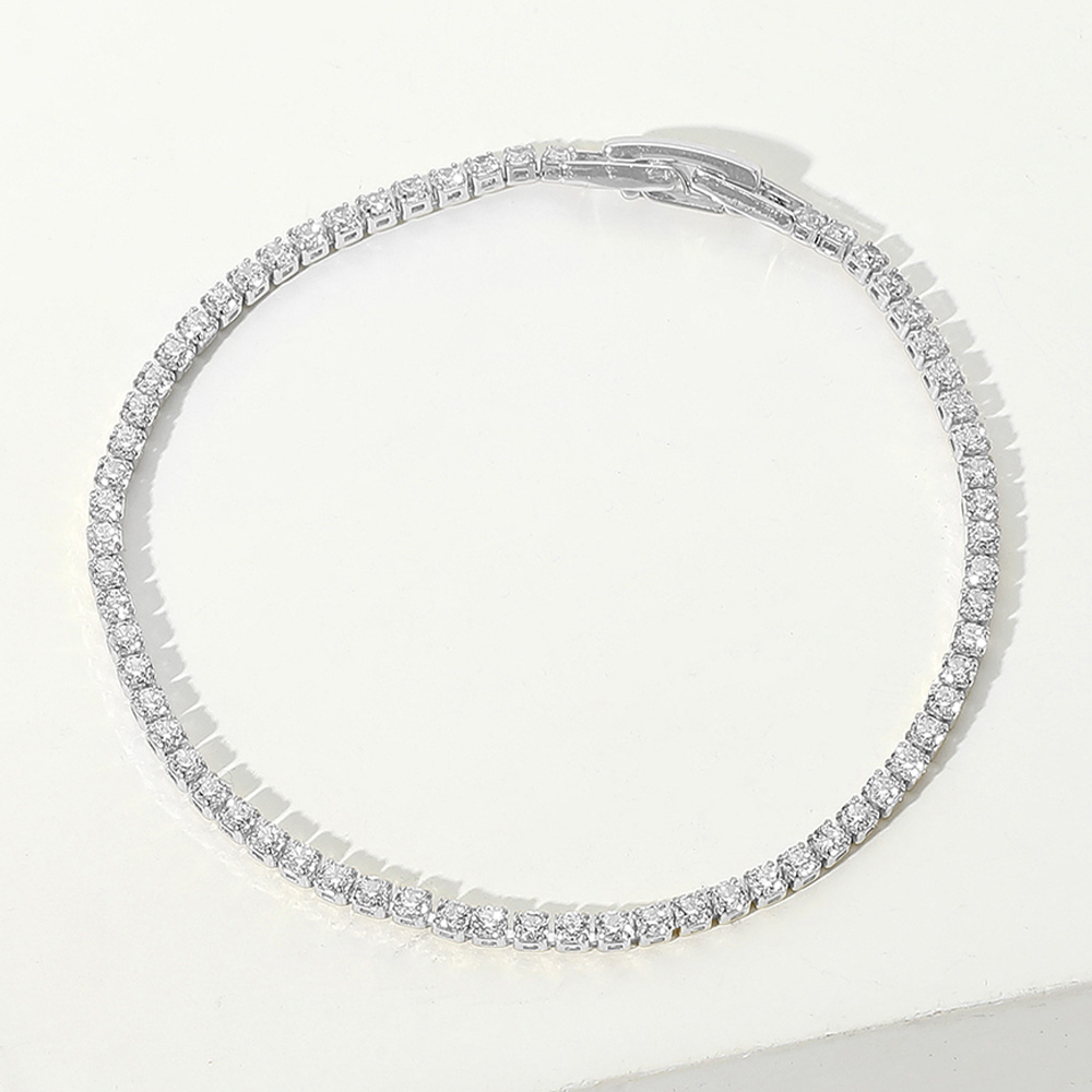 Details • Size : 0.1" H, 6.75" + 0.25" L • Fold Over Closure • Sleek and elegant tennis bracelet adorned with a continuous line of shimmering rhinestones. Perfect for layering or wearing solo, this timeless piece adds a touch of sophistication to everyday or evening wear. • Lead and Nickel Compliant • CZ Cubic Zirconia