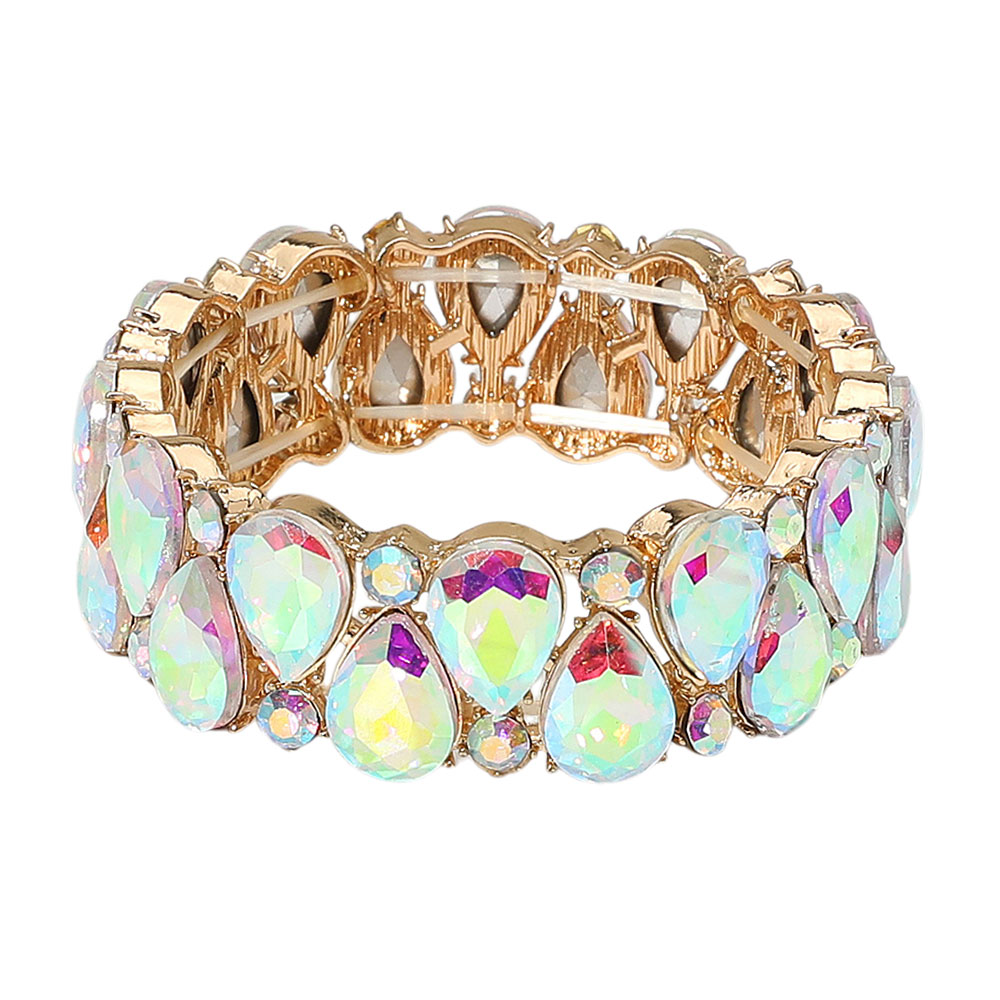 Details • Size : 0.8" H • Stretchable • Elegant stretch bracelet adorned with sparkling teardrop and round gemstones in a bold, eye-catching design. Comfortable to wear and perfect for special occasions, this bracelet adds a touch of glamour to any outfit. • Lead and Nickel Compliant