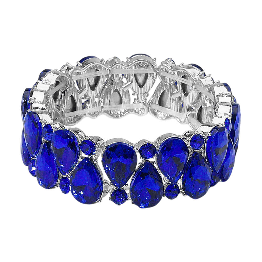 • Elegant stretch bracelet adorned with sparkling teardrop and round gemstones in a bold, eye-catching design. Comfortable to wear and perfect for special occasions, this bracelet adds a touch of glamour to any outfit.