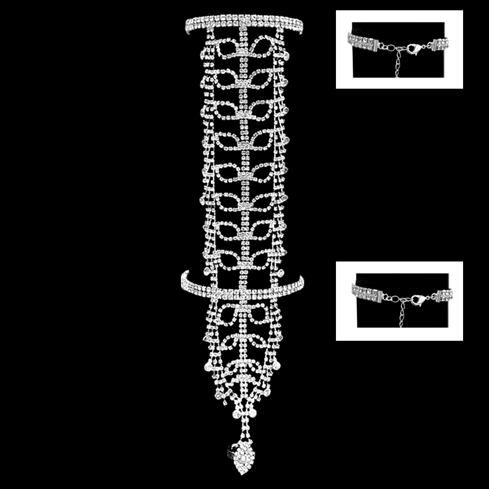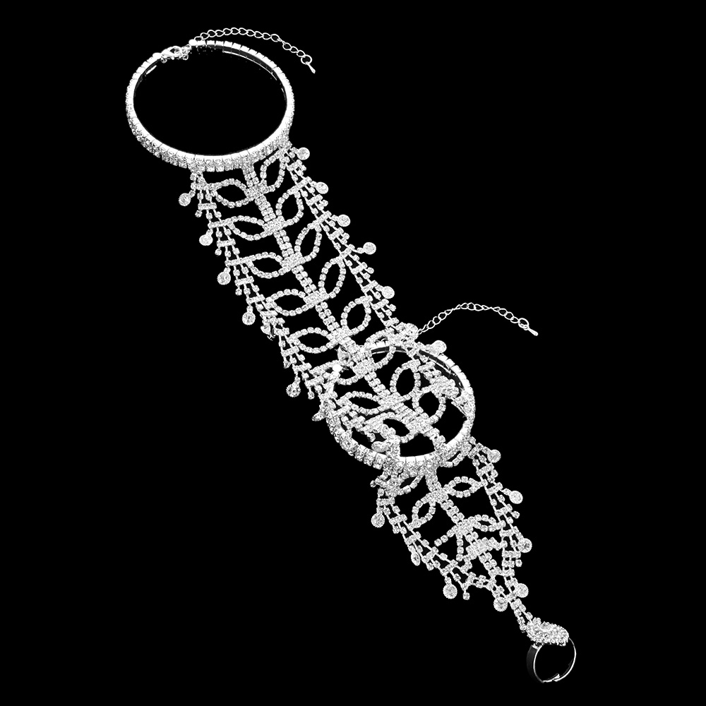 Wide Crystal Rhinestone Pave Leaf Bridal Hand Chain Evening Bracelet