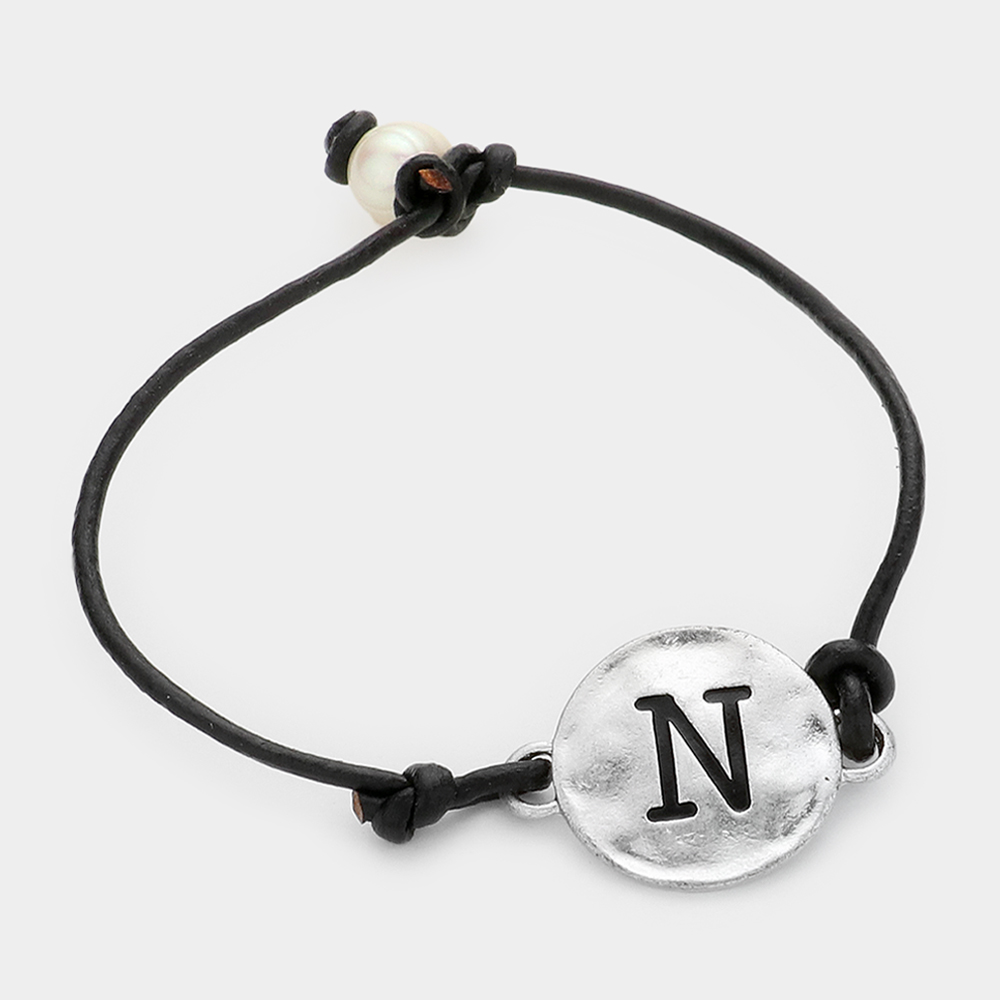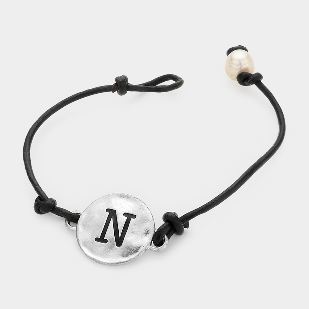 -N- Initial Monogram Metal Disc Pearl Pointed Bracelet