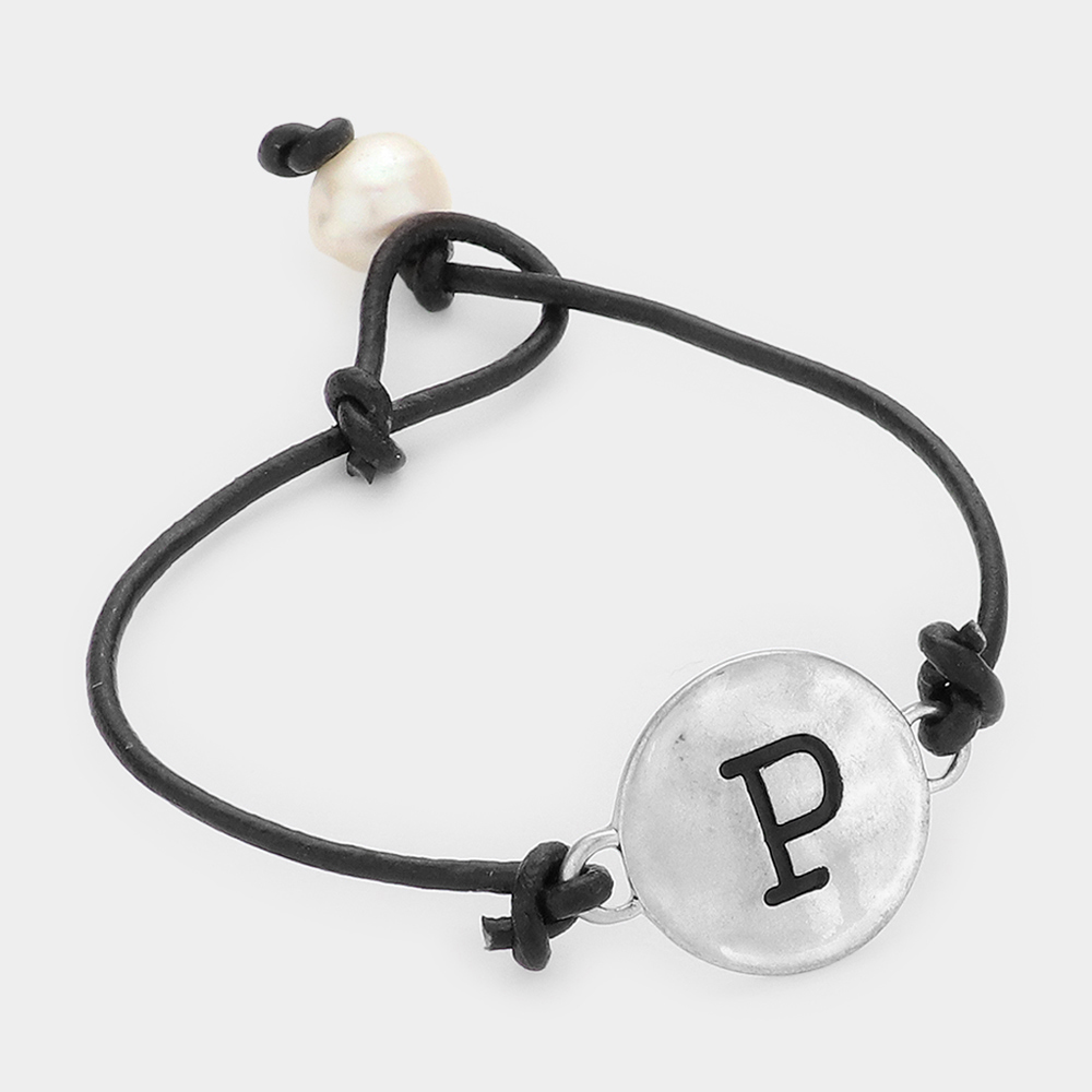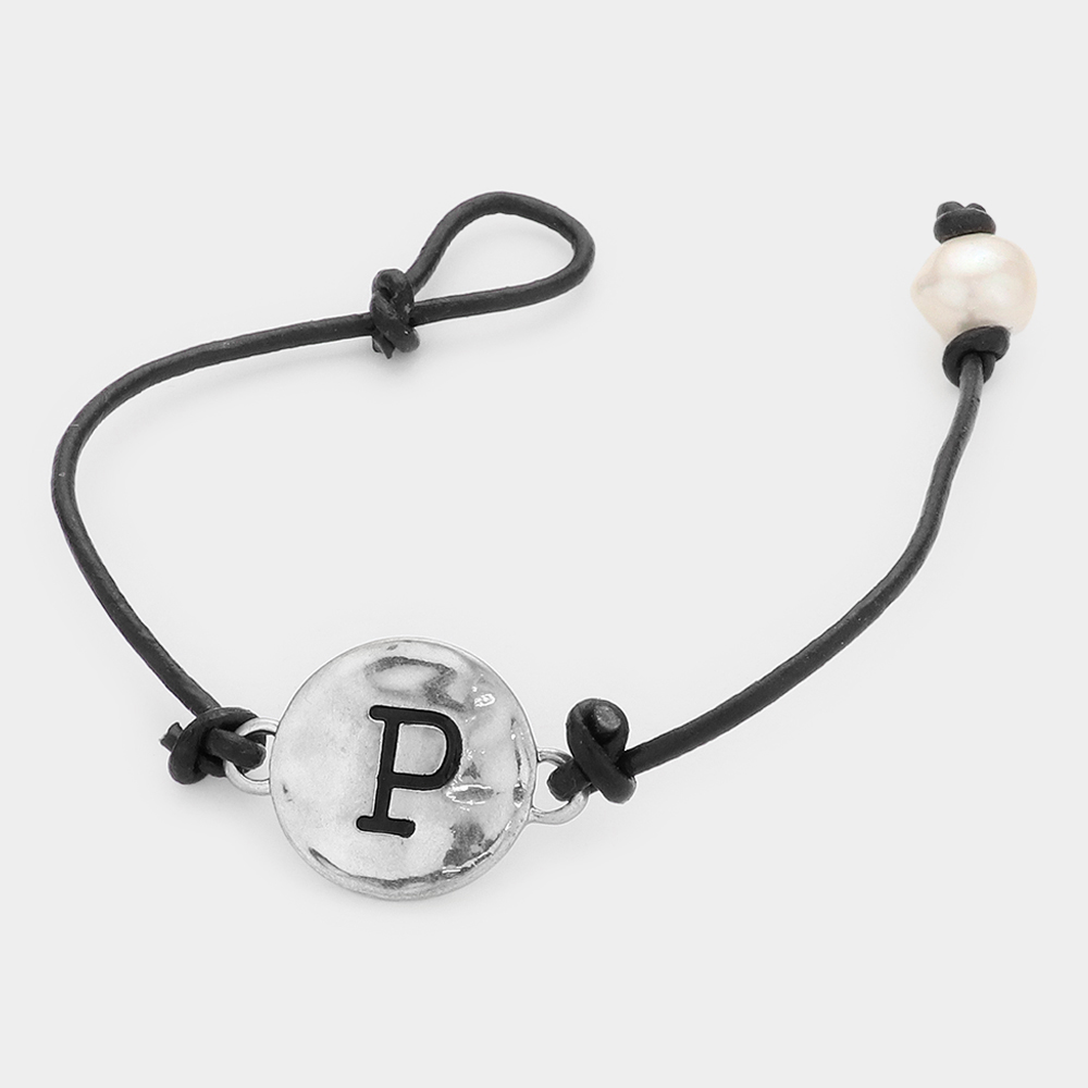 -P- Initial Monogram Metal Disc Pearl Pointed Bracelet