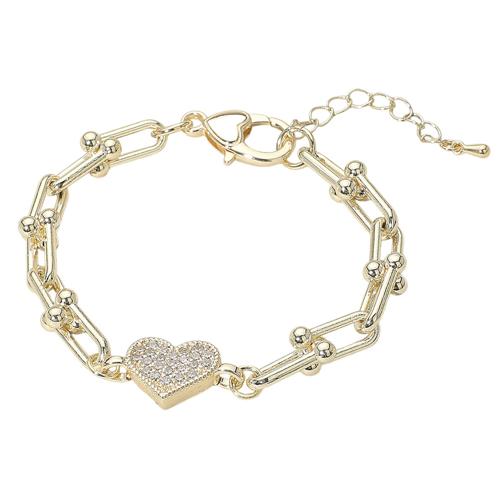 Details • Size : 0.6" H, 7.5" + 2" L • Lobster Clasp Closure • Chic link bracelet featuring geometric connectors accented with delicate bead details, centered by a sparkling pave heart charm. Adjustable for the perfect fit, this bracelet adds romantic elegance to any outfit, making it a versatile accessory for casual wear or special occasions. • Gold Dipped • CZ Cubic Zirconia