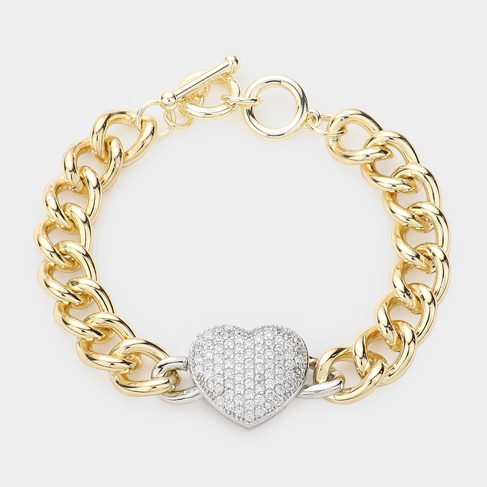 14K Gold Plated CZ Stone Paved Heart Pendant Accented Chain Toggle Bracelet