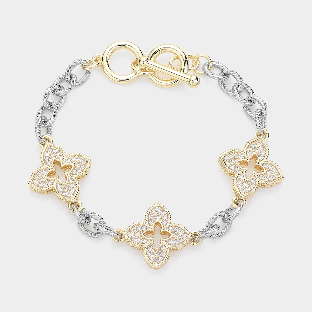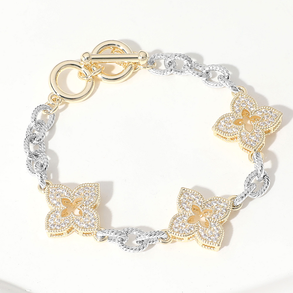 14K Gold Plated CZ Stone Paved Clover Link Two Tone Toggle Bracelet