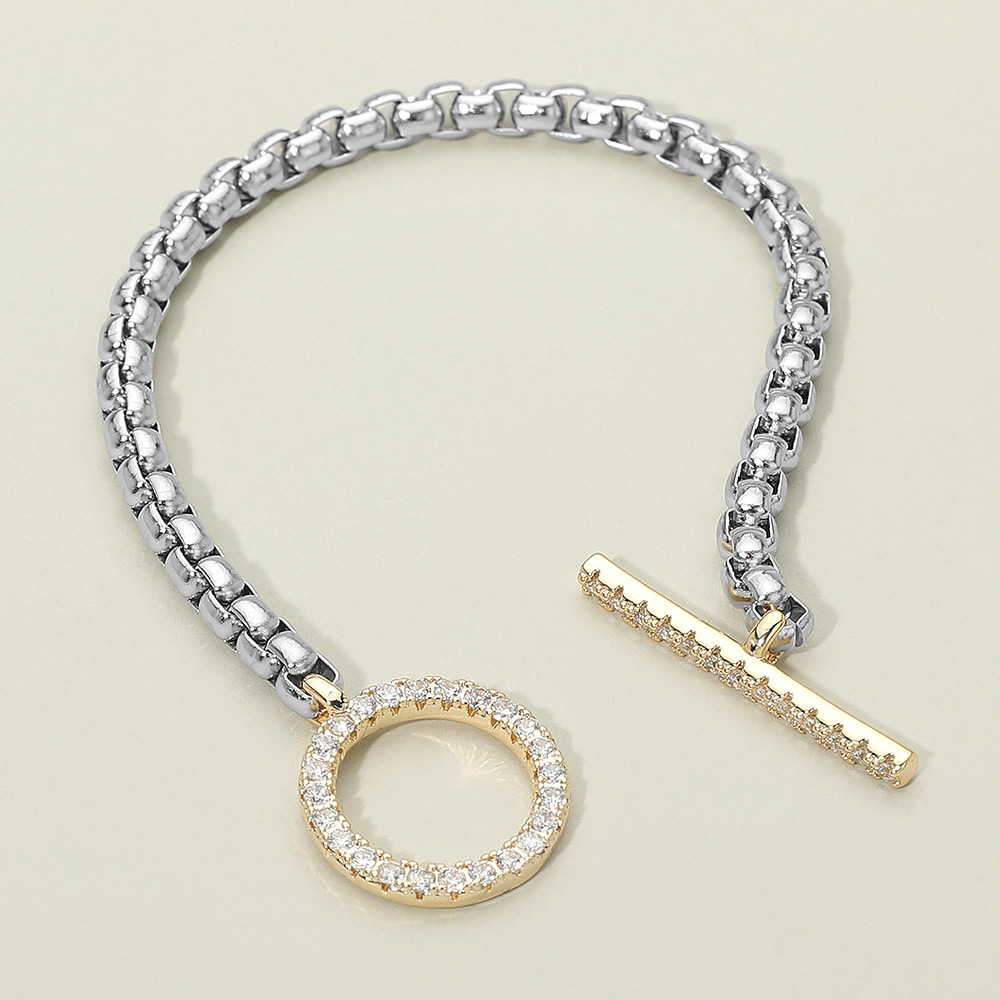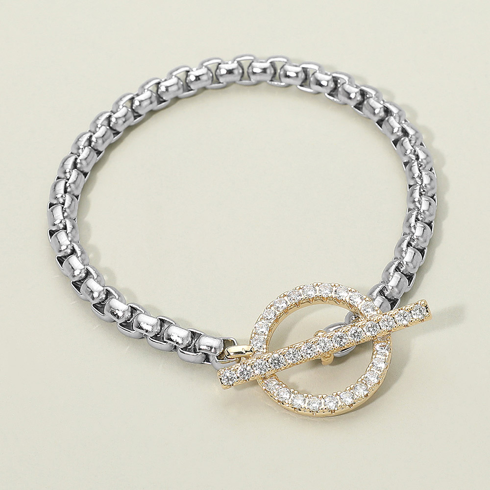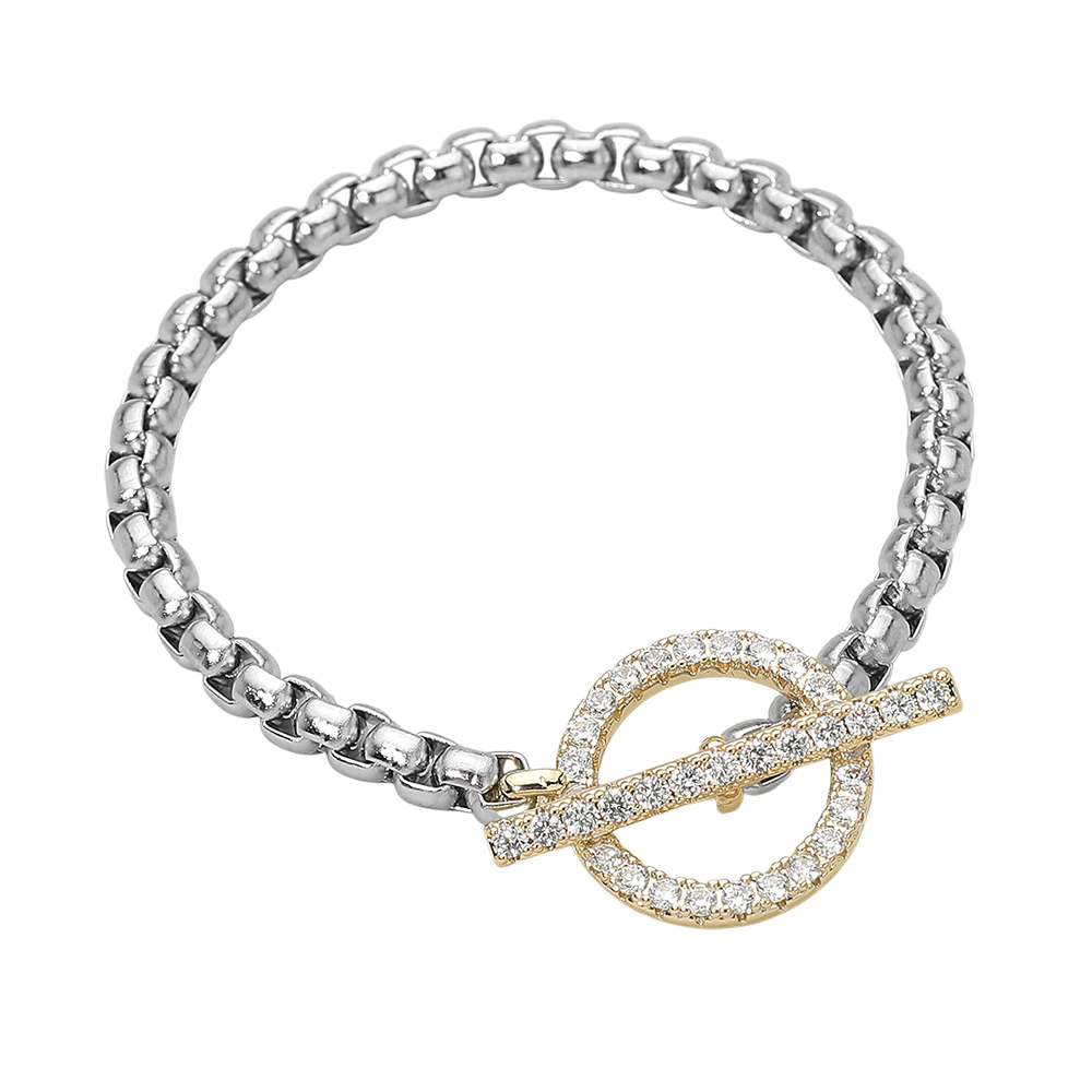 Details • Size : 1.25" H, 7" + 0.8" L • Toggle Closure • Chic box link bracelet accented with a sparkling pave toggle closure for a striking focal point. Designed to blend sophistication with versatility, this bracelet is ideal for layering or wearing solo, adding modern elegance to both everyday and evening styles. • CZ Cubic Zirconia • Gold Dipped
