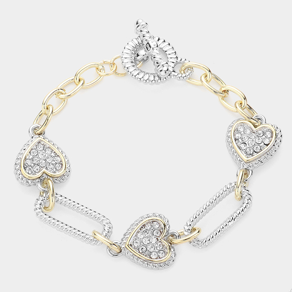 14K Gold Plated Stone Paved Heart Textured Link Toggle Bracelet