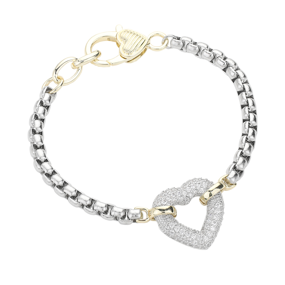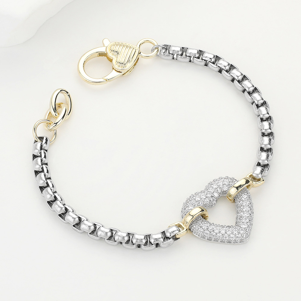 Two Tone 14K Gold Plated CZ Stone Paved Heart Charm Bracelet