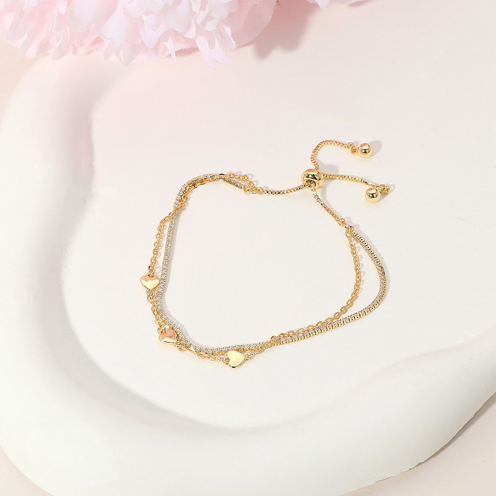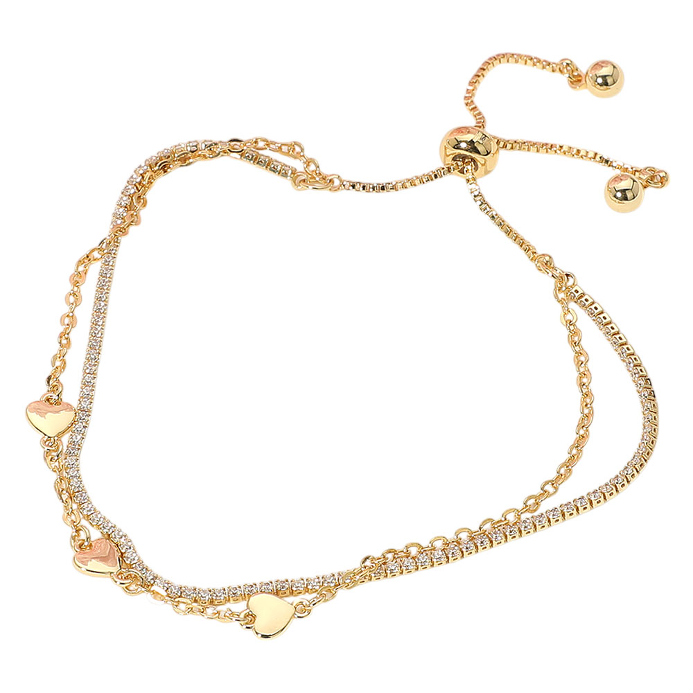 18K Gold Dipped Heart Charm Station Rhinestone Layered Adjustable Cinch Pull Tie Bracelet