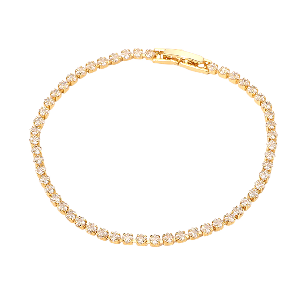 Details • Size : 0.1" H, 6.5" + 1" L • Fold Over Closure • Graceful and refined, this slim crystal tennis bracelet offers a touch of timeless brilliance. Its sleek, minimalist design enhances any outfit with subtle sparkle, making it perfect for everyday elegance or special occasions. A must-have accessory that complements any jewelry collection. • Gold Dipped • Lead and Nickel Compliant