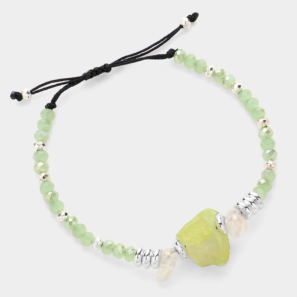 Details • Size : 0.75" H • Adjustable • Embrace earthy elegance with this adjustable bracelet featuring faceted beads, metallic details, and a striking raw stone centerpiece. Ideal for adding a natural, boho-inspired touch to everyday looks or layered accessory combinations.