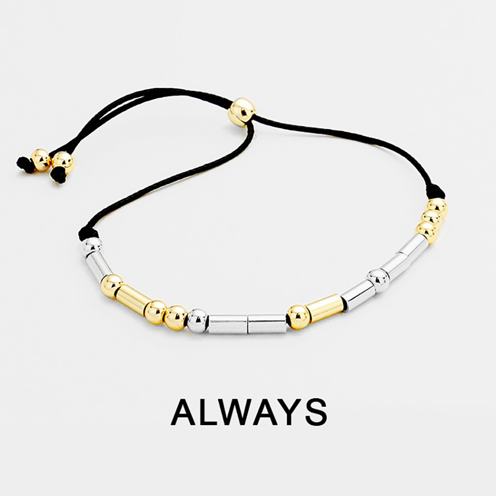 Details • Size : 0.1" H • Adjustable • Express lasting devotion with this Morse code bracelet spelling ALWAYS. Designed with metallic beads on an adjustable cord, this meaningful accessory is a stylish way to carry love, loyalty, and timeless sentiment, making it a heartfelt gift or personal keepsake. • Lead and Nickel Compliant