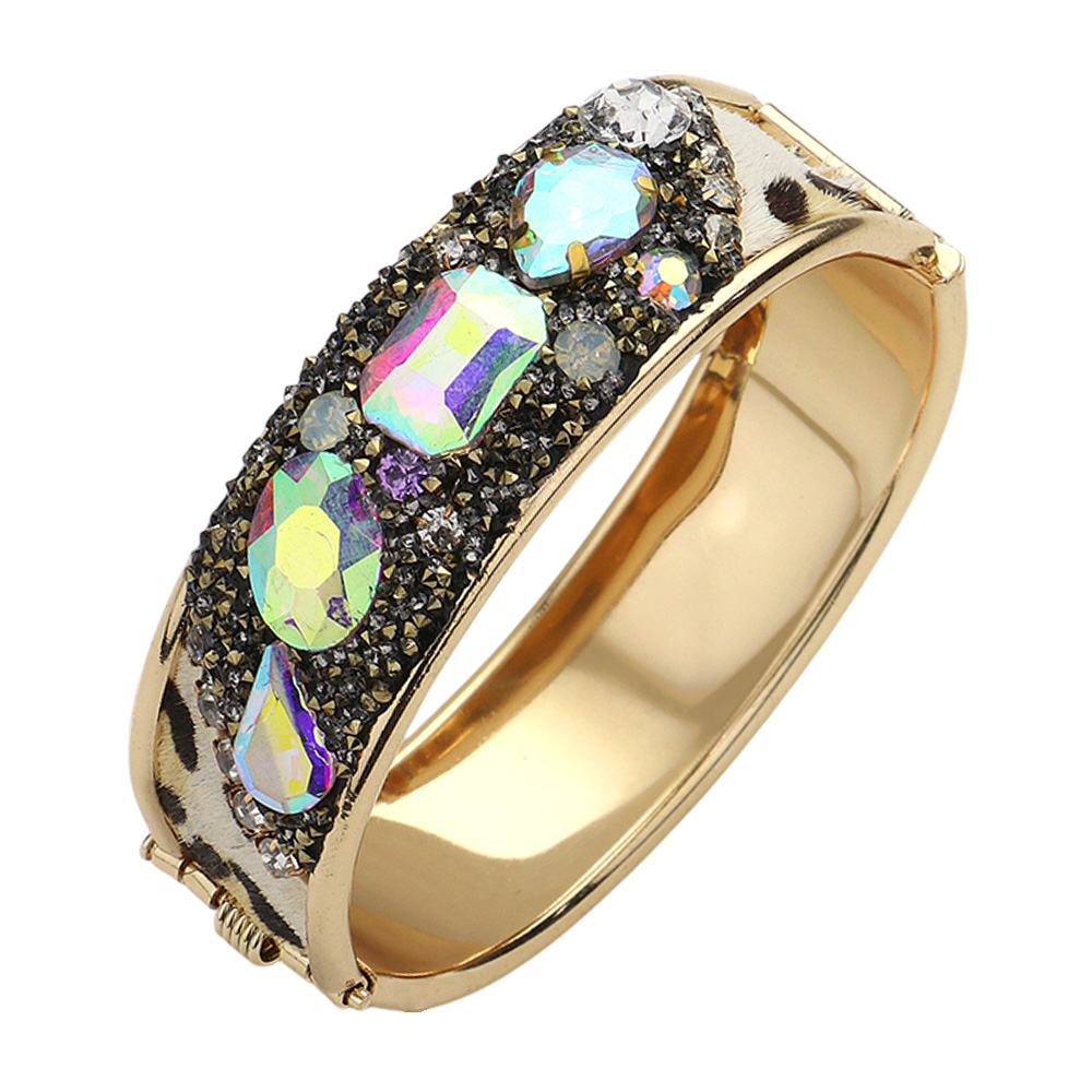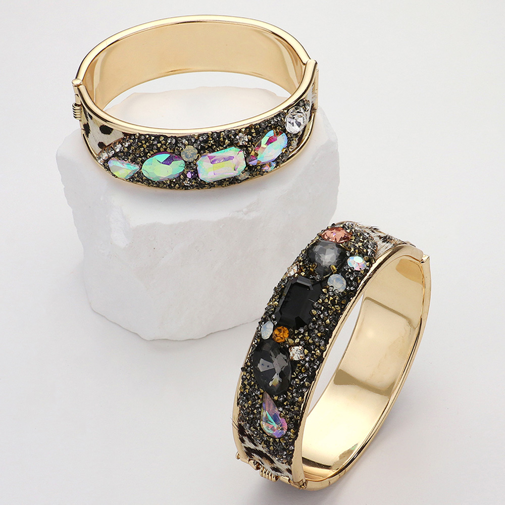 Animal Printed Fur Sparkly Stone Embellished Hinged Bracelet