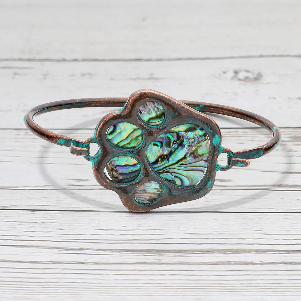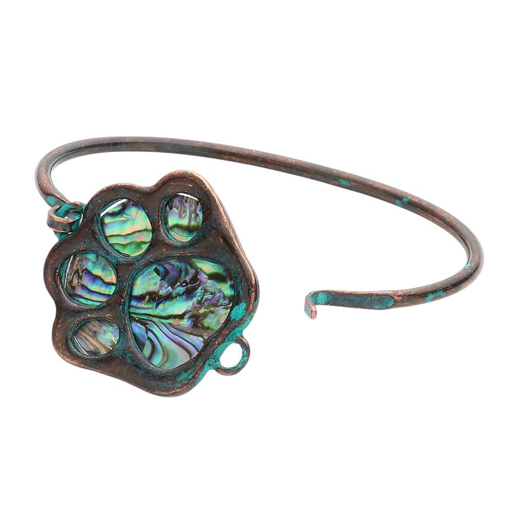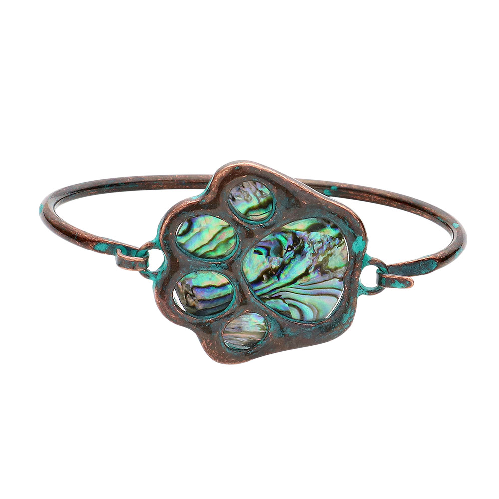 Details • Size : 1.25" H, 2.3" D • Hook Closure • Express your love for animals with this antique paw print abalone bangle bracelet. Featuring a beautifully detailed paw motif with shimmering accents and an artisanal patina finish, it adds charm and personality to any look. A perfect keepsake for pet lovers and collectors alike. • Lead and Nickel Compliant
